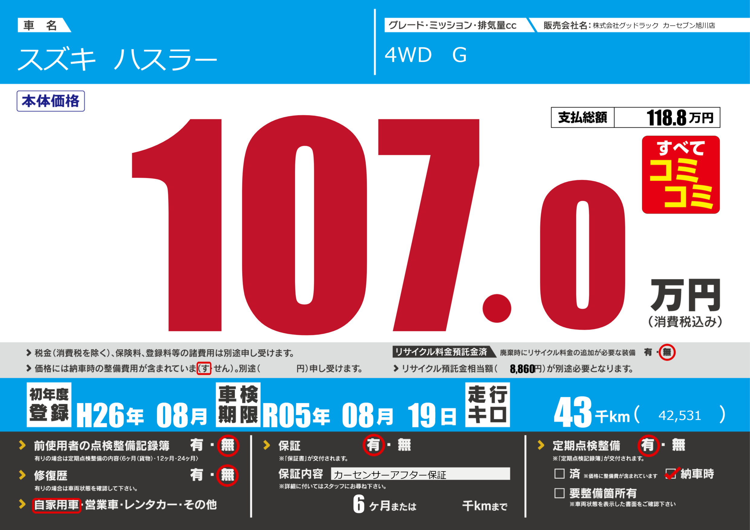 | 車名 | スズキ ハスラー | グレード ミッション 排気量 |