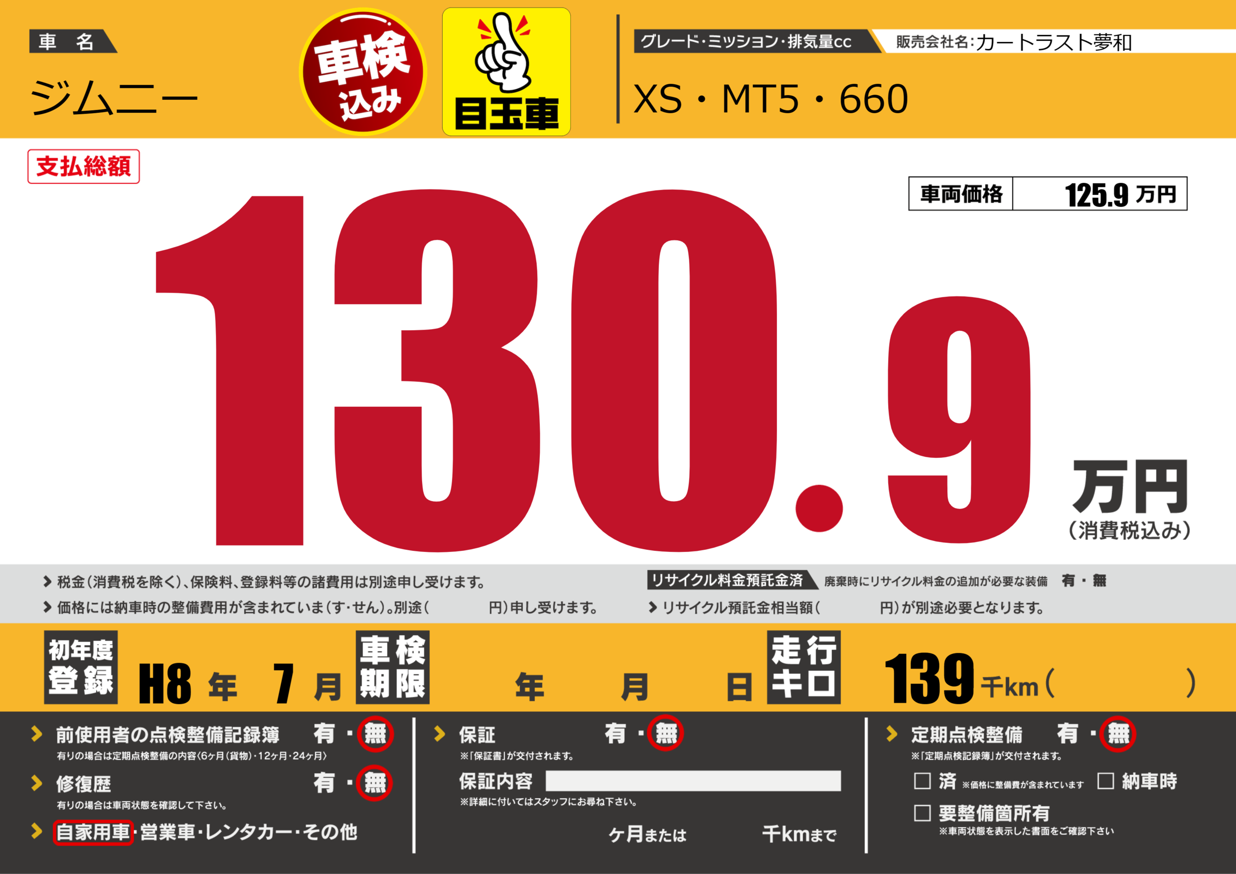 | 走行キロ | 13.9万km | 初年度登録 | H8年7月 |
