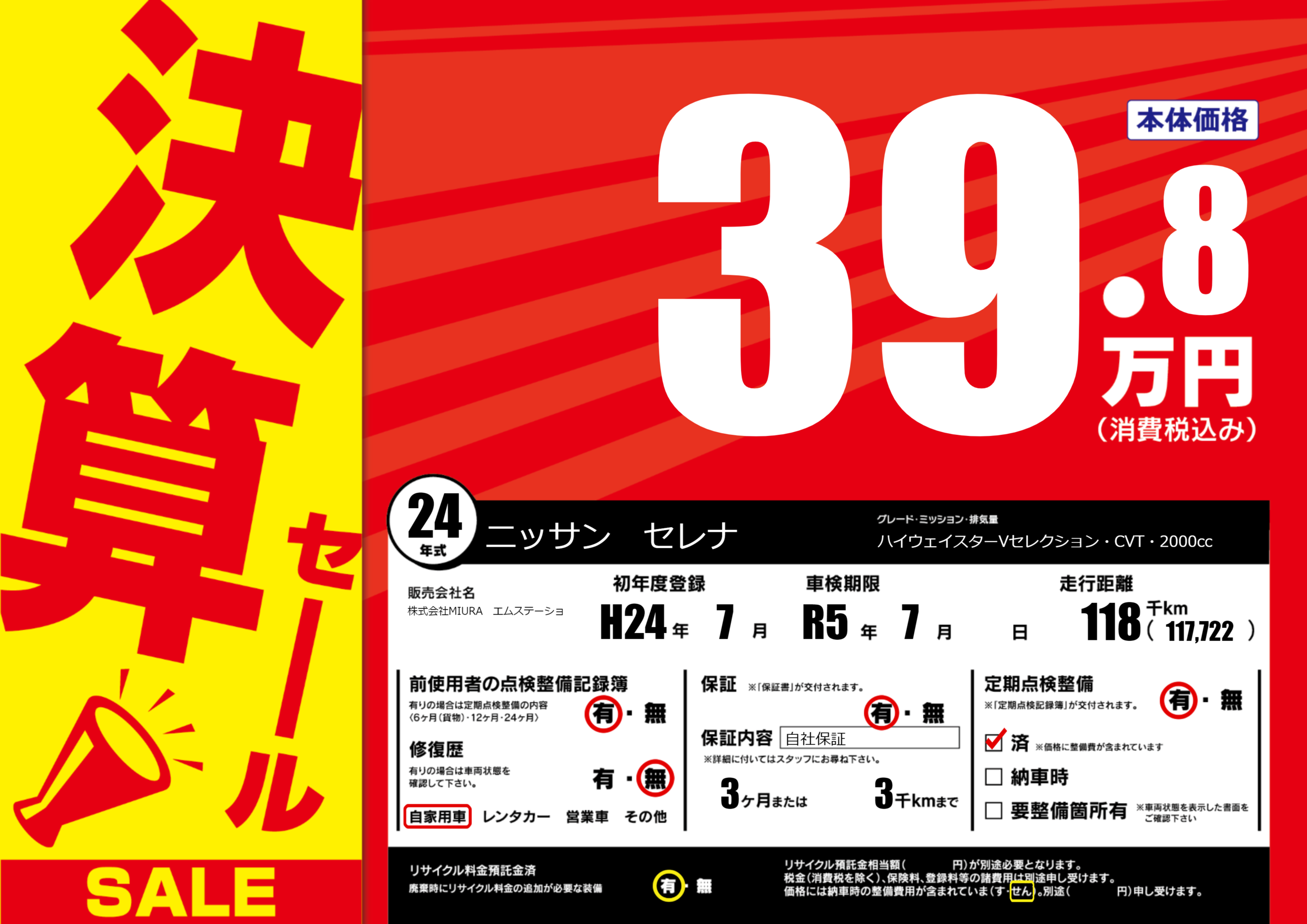 | 定期点検整備 | 定期点検整備あり 定期点検整備済み | ||