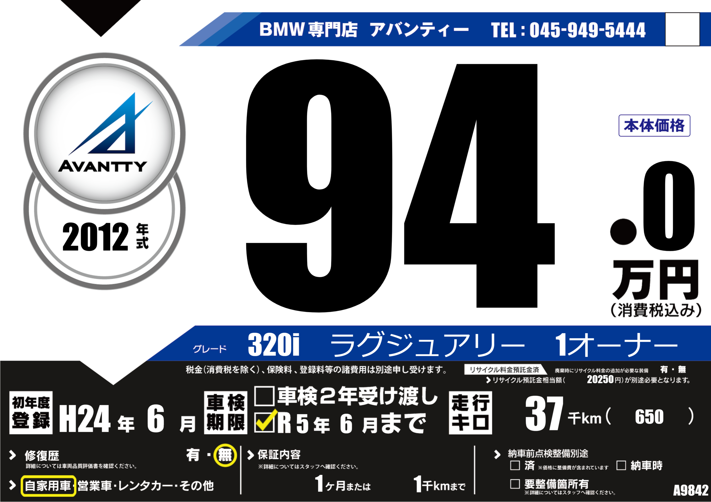 | 走行キロ | 3.7万km | 初年度登録 | H24年6月 |