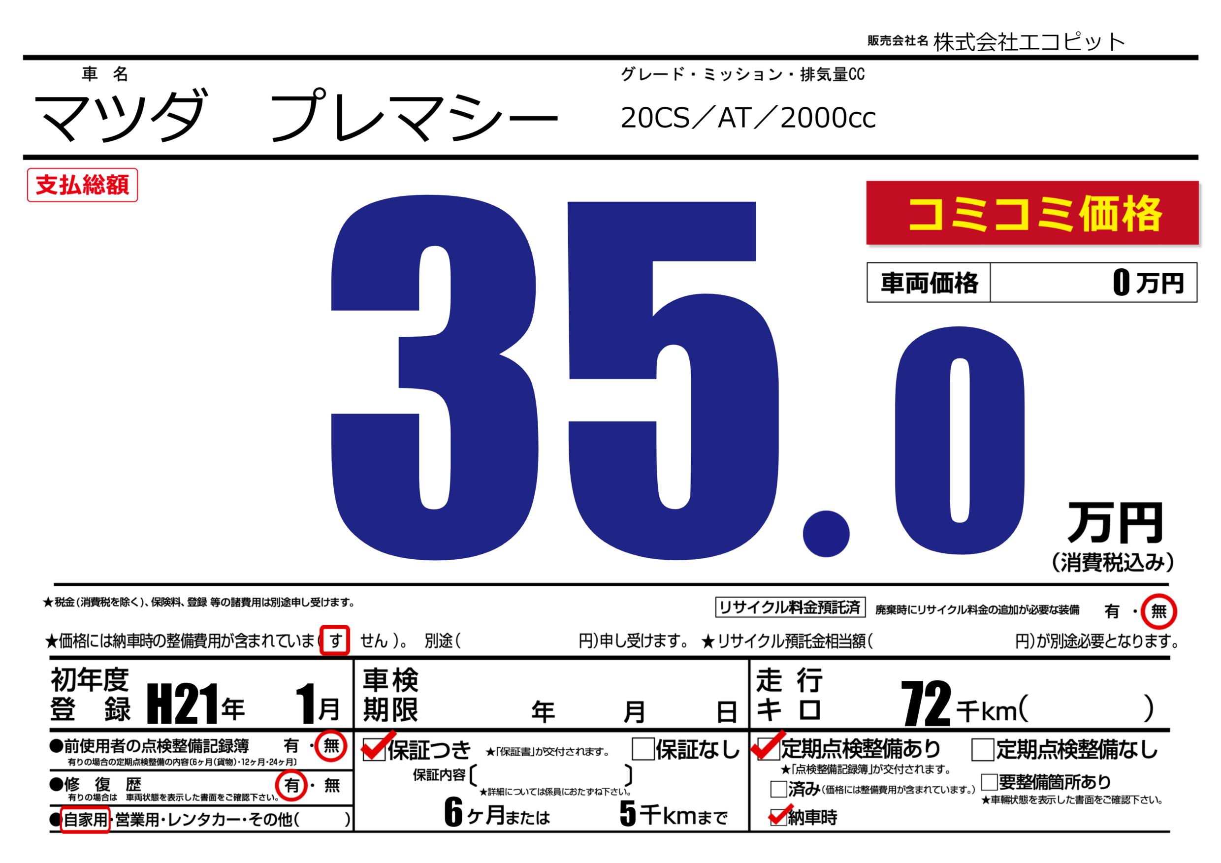 | 車名 | マツダ プレマシー | グレード ミッション 排気量 |