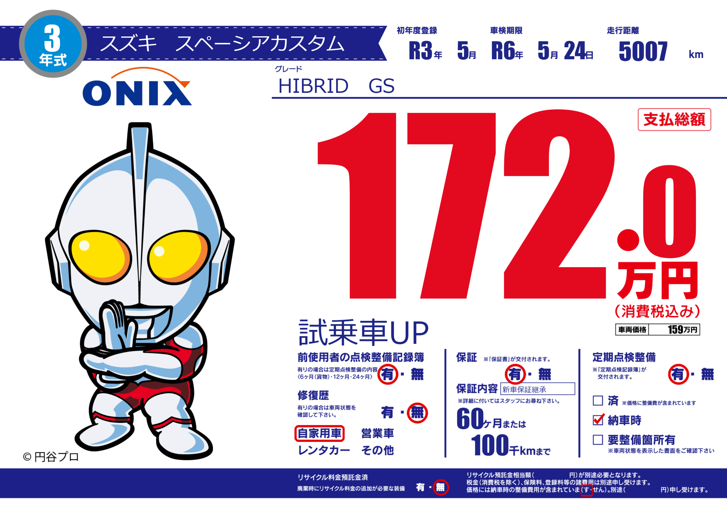 | 車名 | スズキ スペーシアカスタム | グレード ミッション 排気量 |