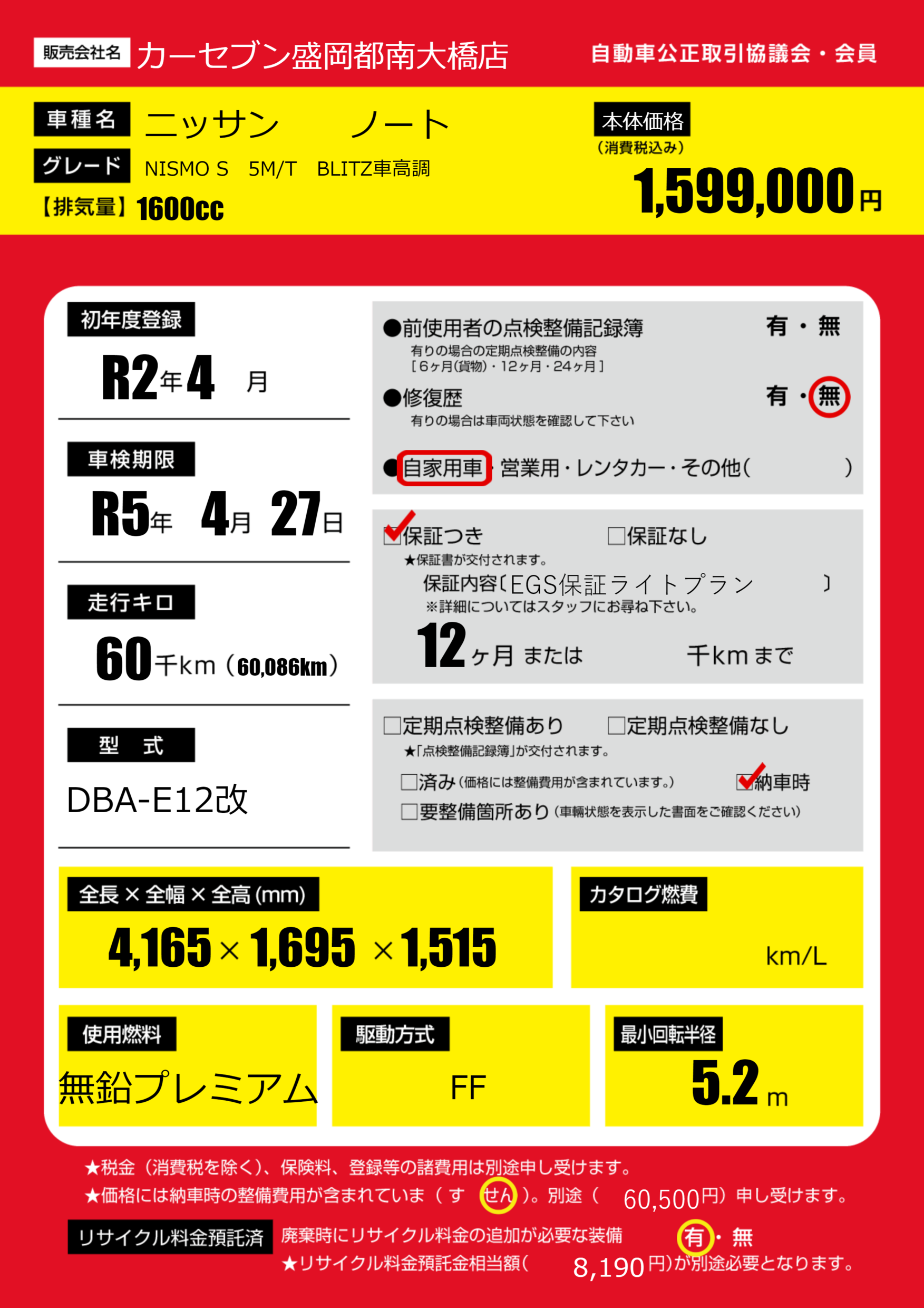 | 車名 | ニッサン ノート | グレード ミッション 排気量 |