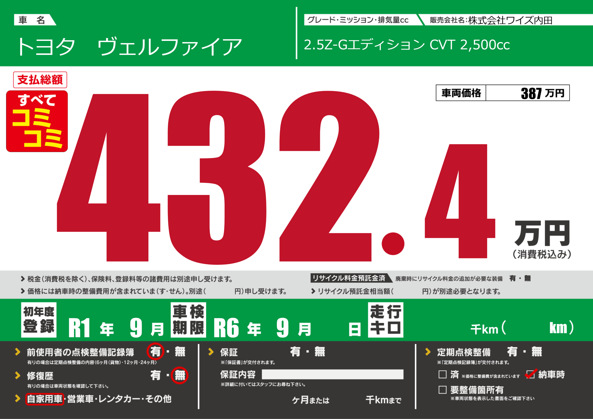 | 車名 | トヨタ ヴェルファイア | グレード ミッション 排気量 |