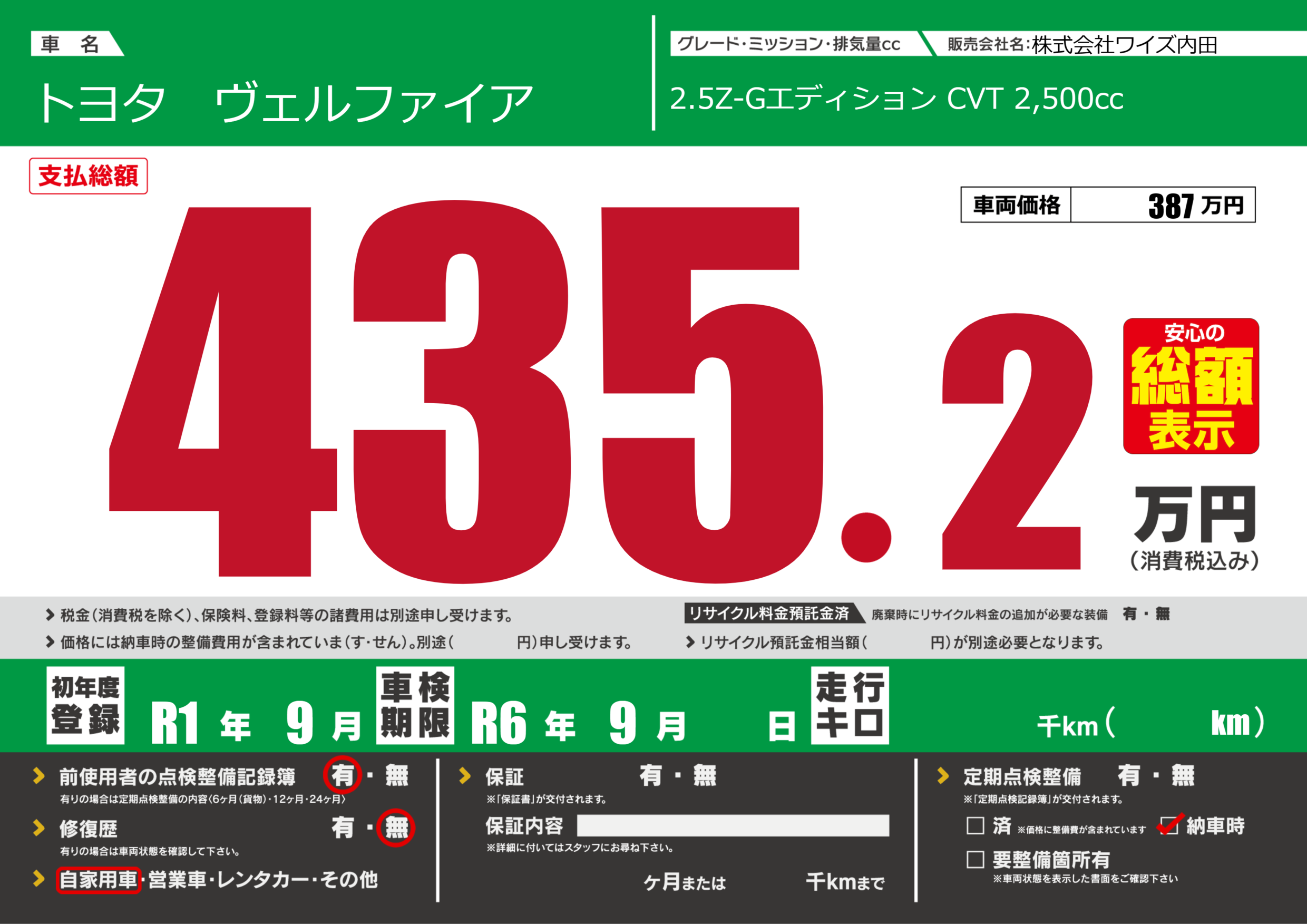 | 車検制限 | R6年 9月 - 日 | ||
