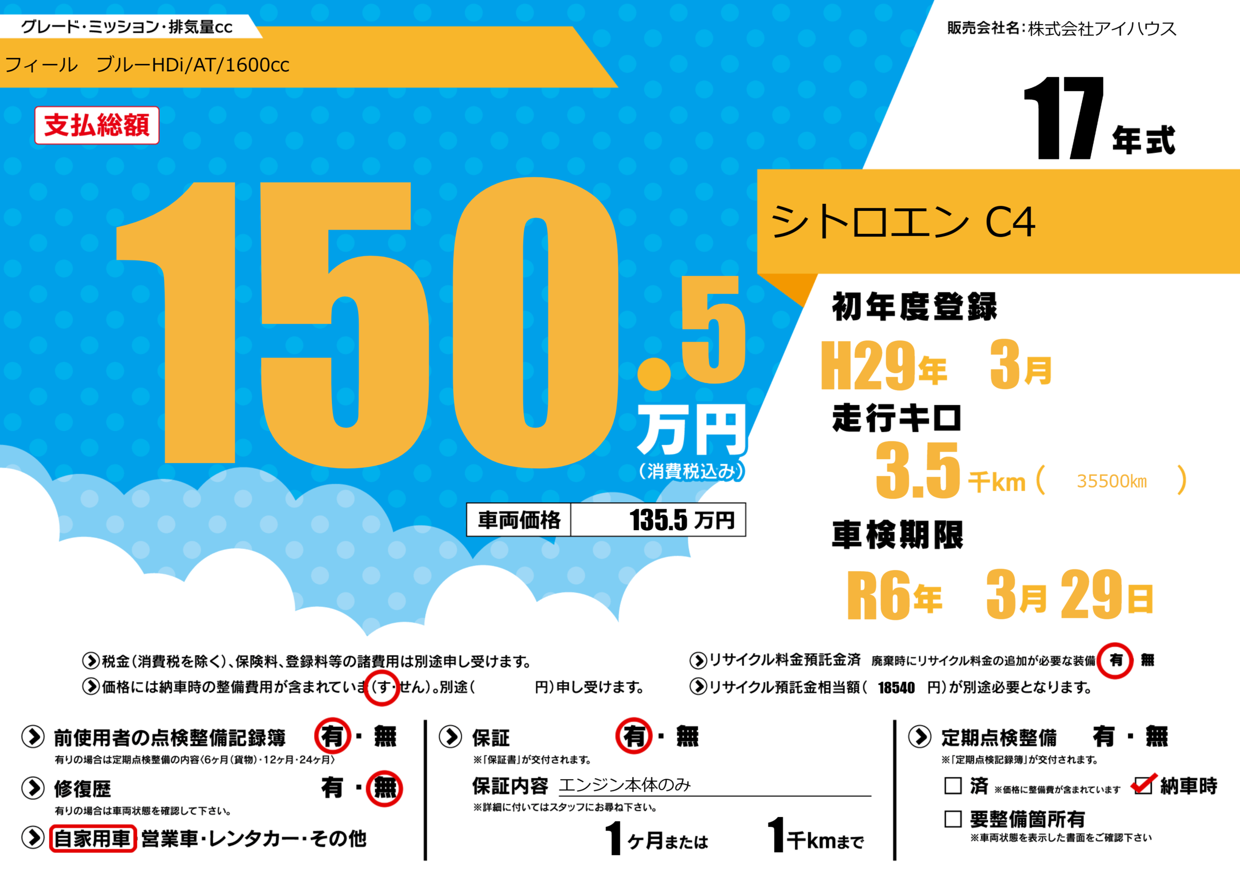 | 車名 | シトロエン C4 | グレード ミッション 排気量 |
