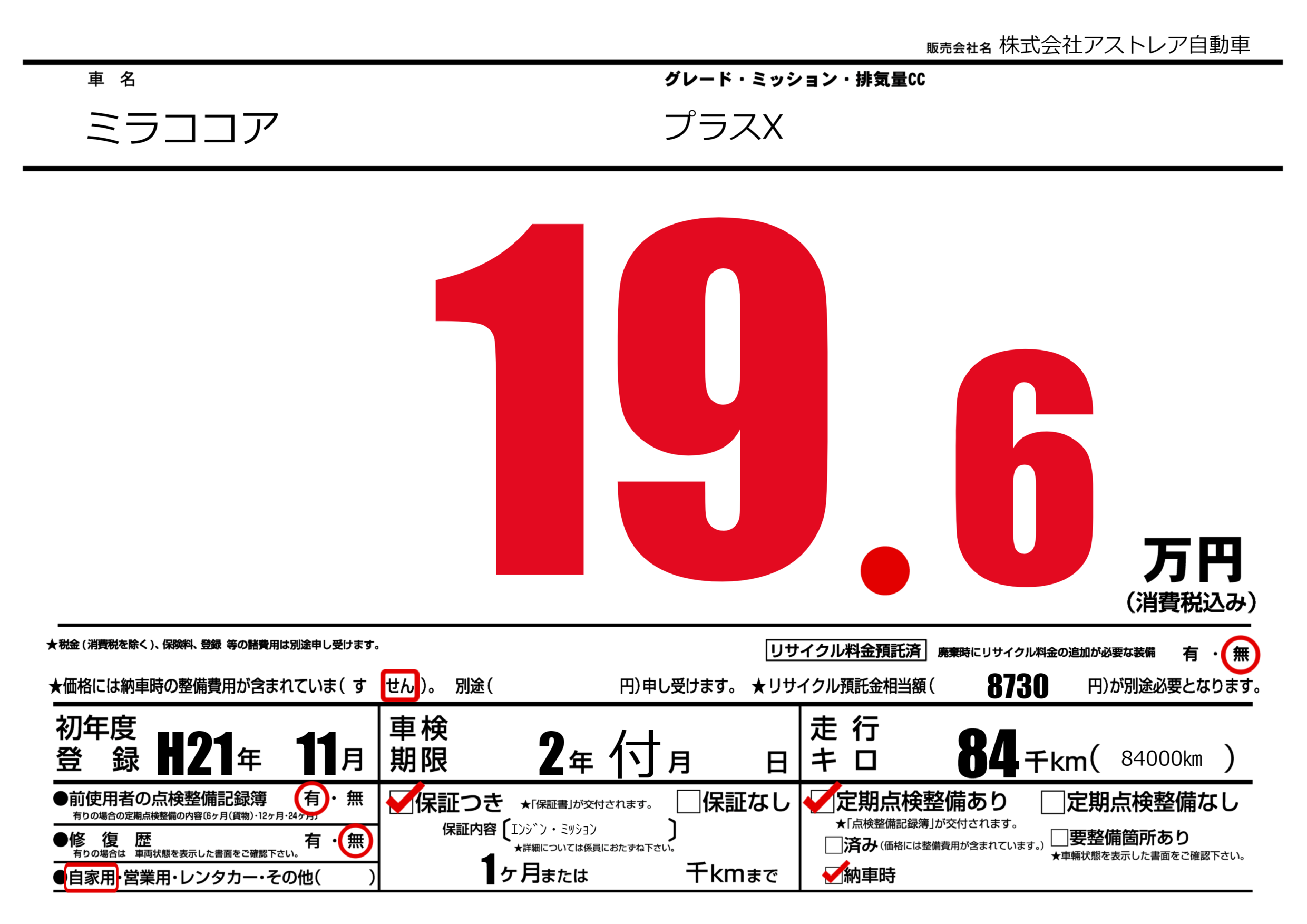 | 車名 | ミラココア | グレード ミッション 排気量 |