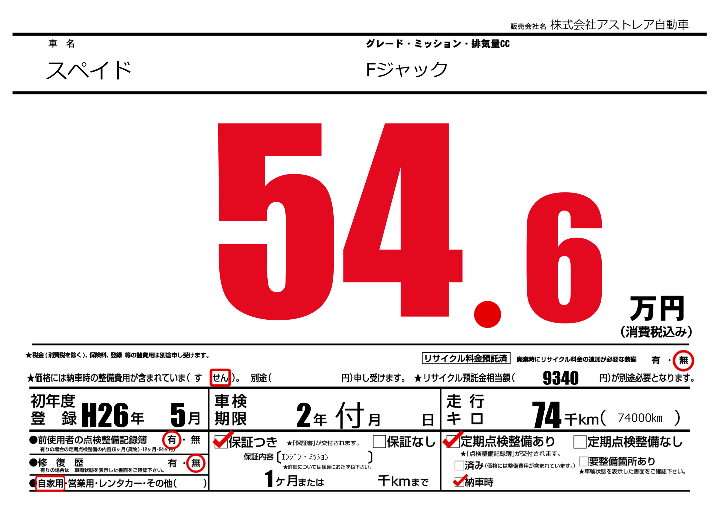 | 車名 | スペイド | グレード ミッション 排気量 |
