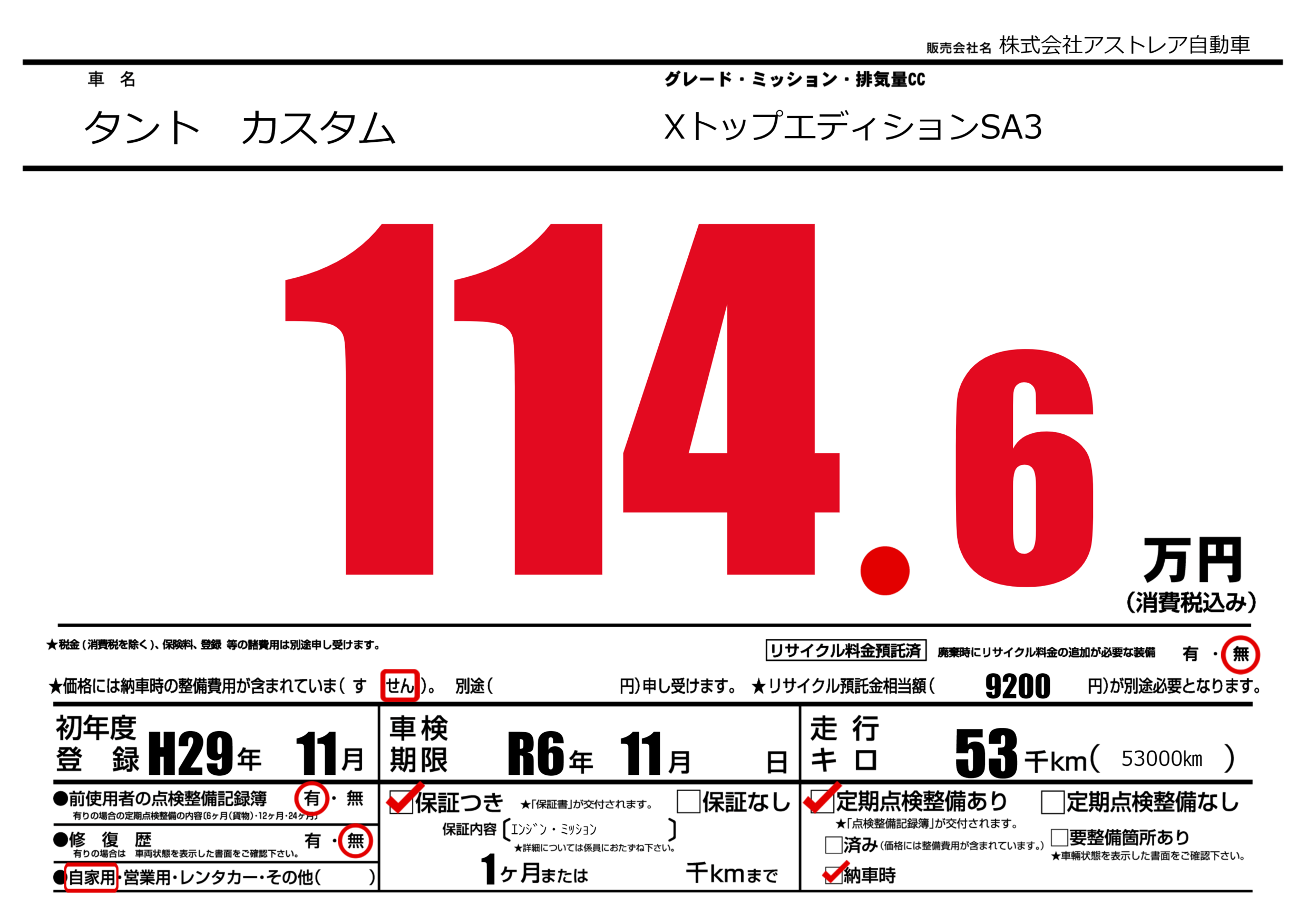 | 定期点検整備 | 定期点検整備あり 納車時あり | ||