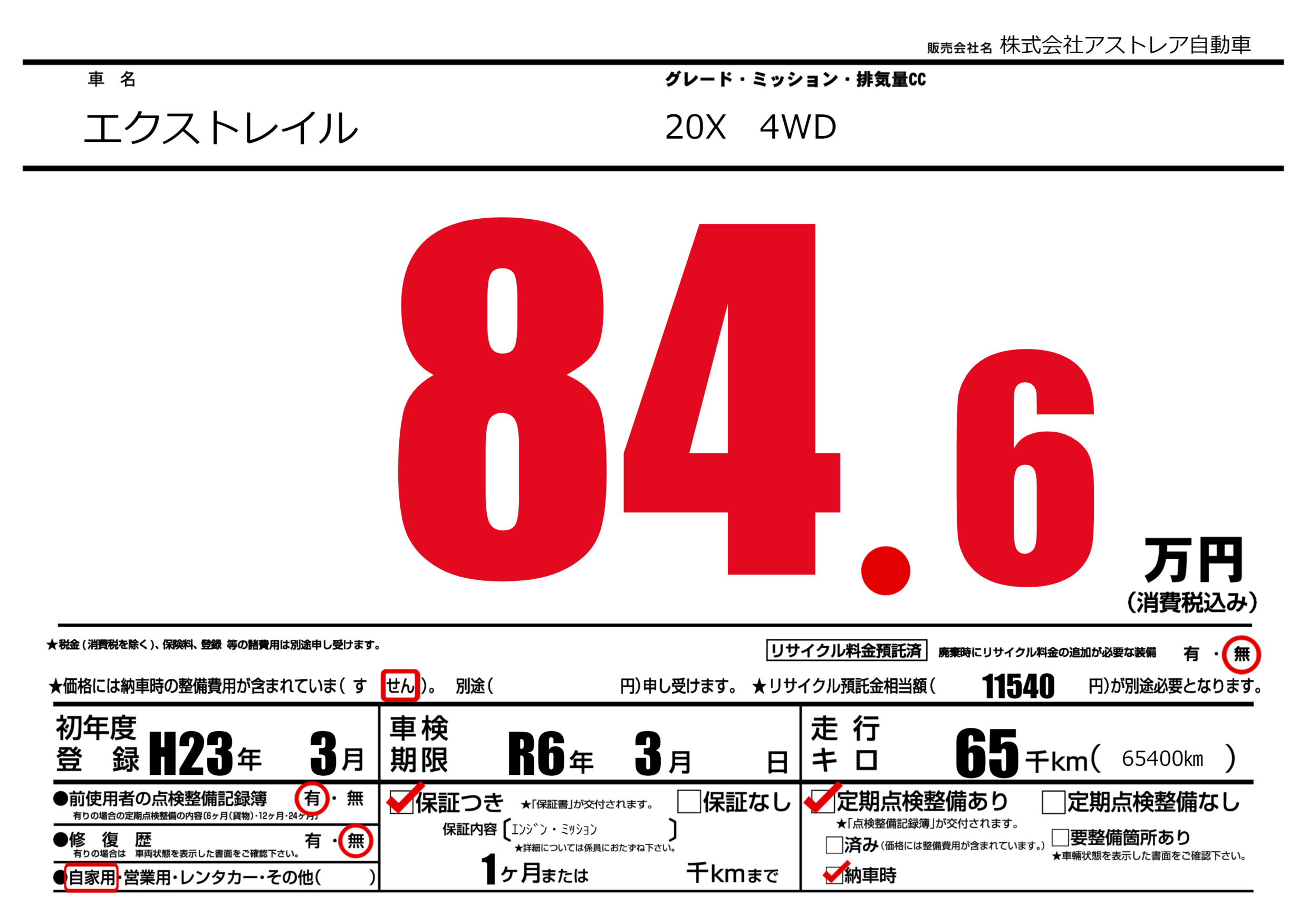 | 車名 | エクストレイル | グレード ミッション 排気量 |