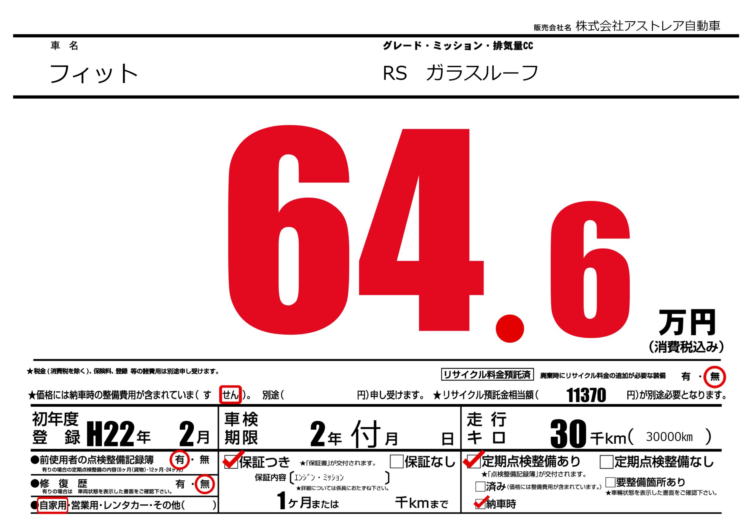 | 走行キロ | 3万km | 初年度登録 | H22年2月 |