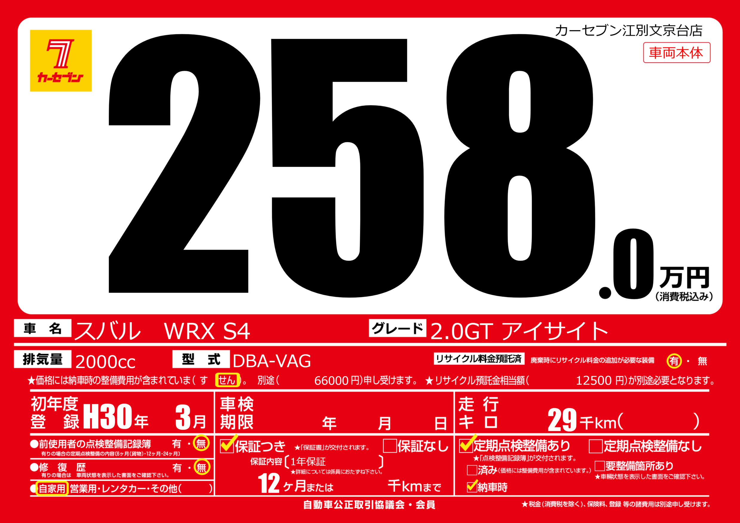 | 車名 | スバル WRX S4 | グレード ミッション 排気量 |