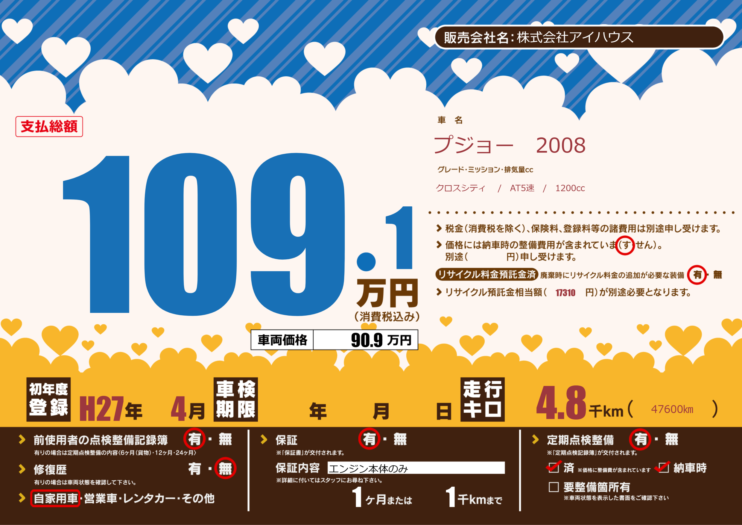 | 定期点検整備 | 定期点検整備あり 定期点検整備済み 納車時あり | ||