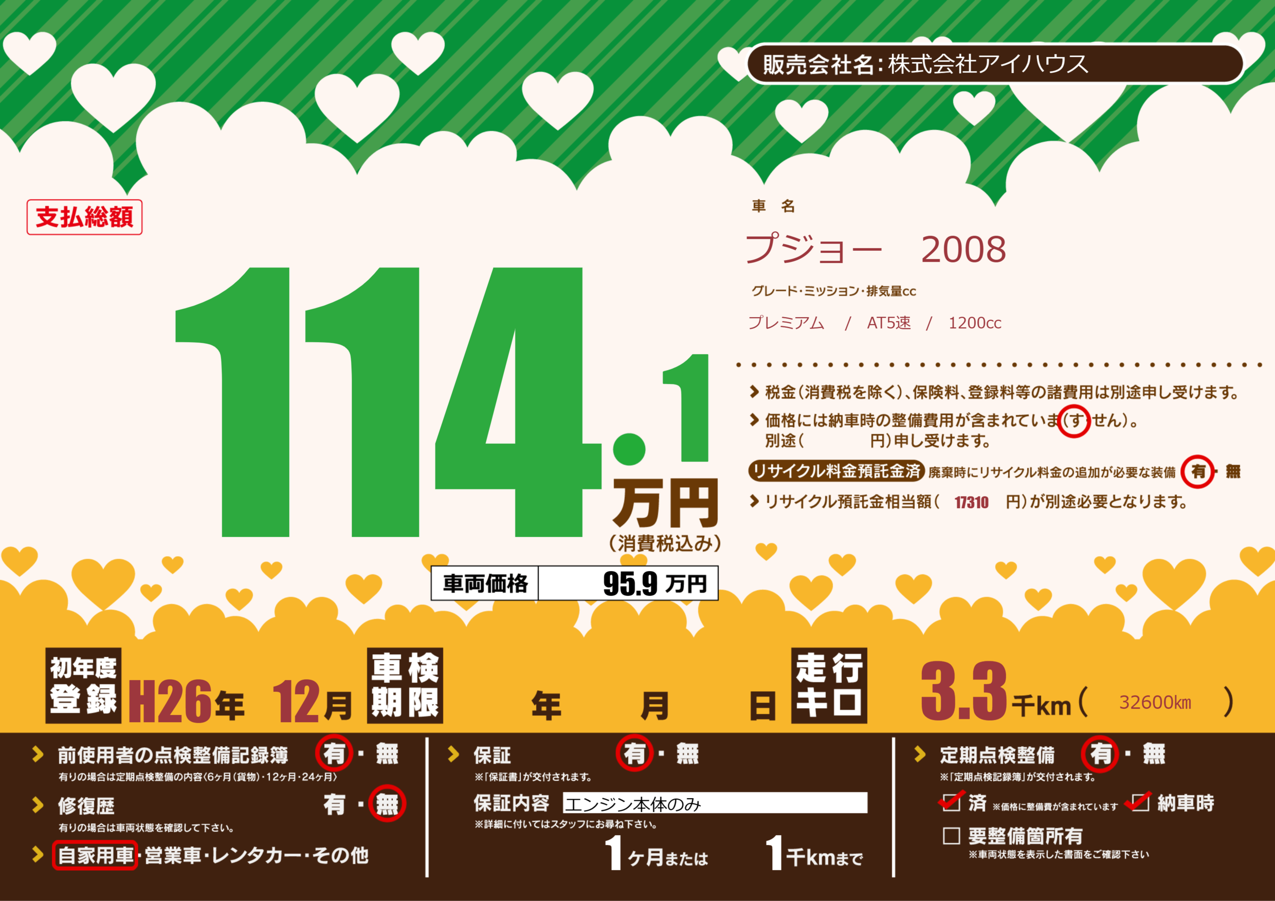| 定期点検整備 | 定期点検整備あり 定期点検整備済み 納車時あり | ||