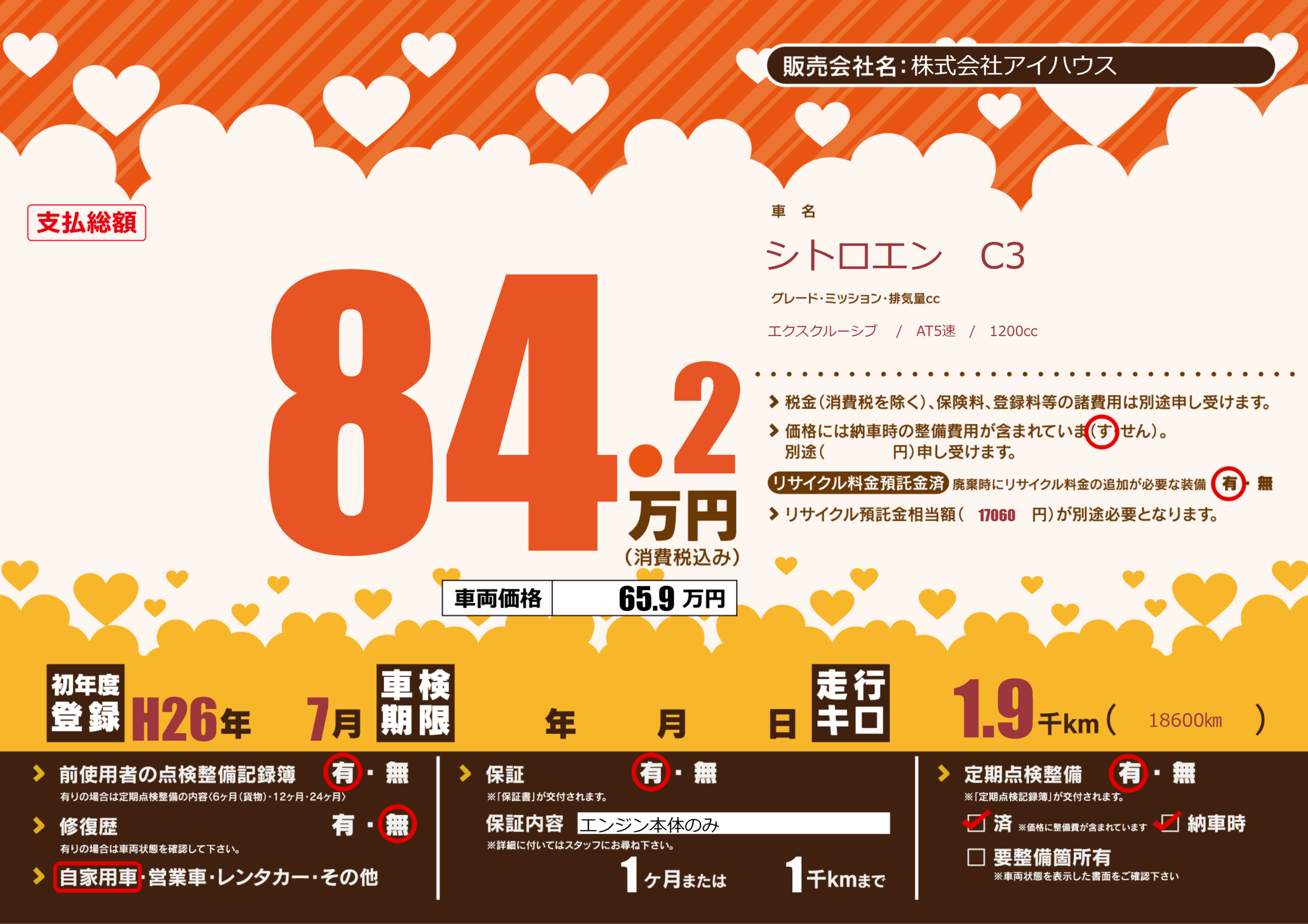 | 車名 | シトロエン C3 | グレード ミッション 排気量 |
