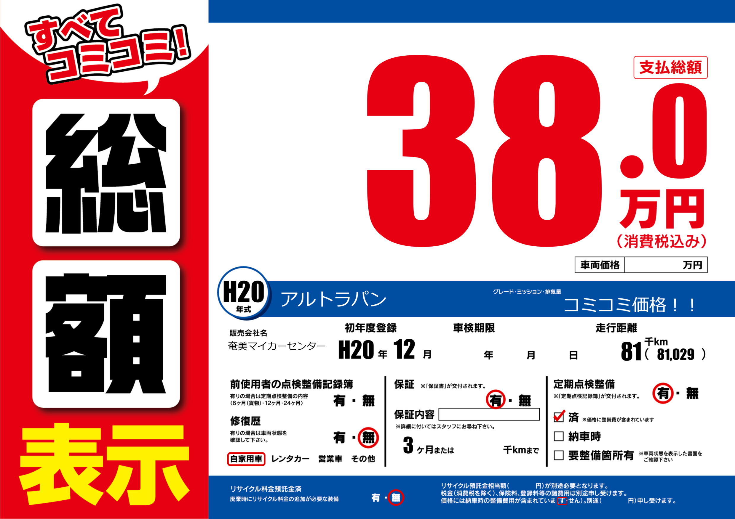 | 定期点検整備 | 定期点検整備あり 定期点検整備済み | ||