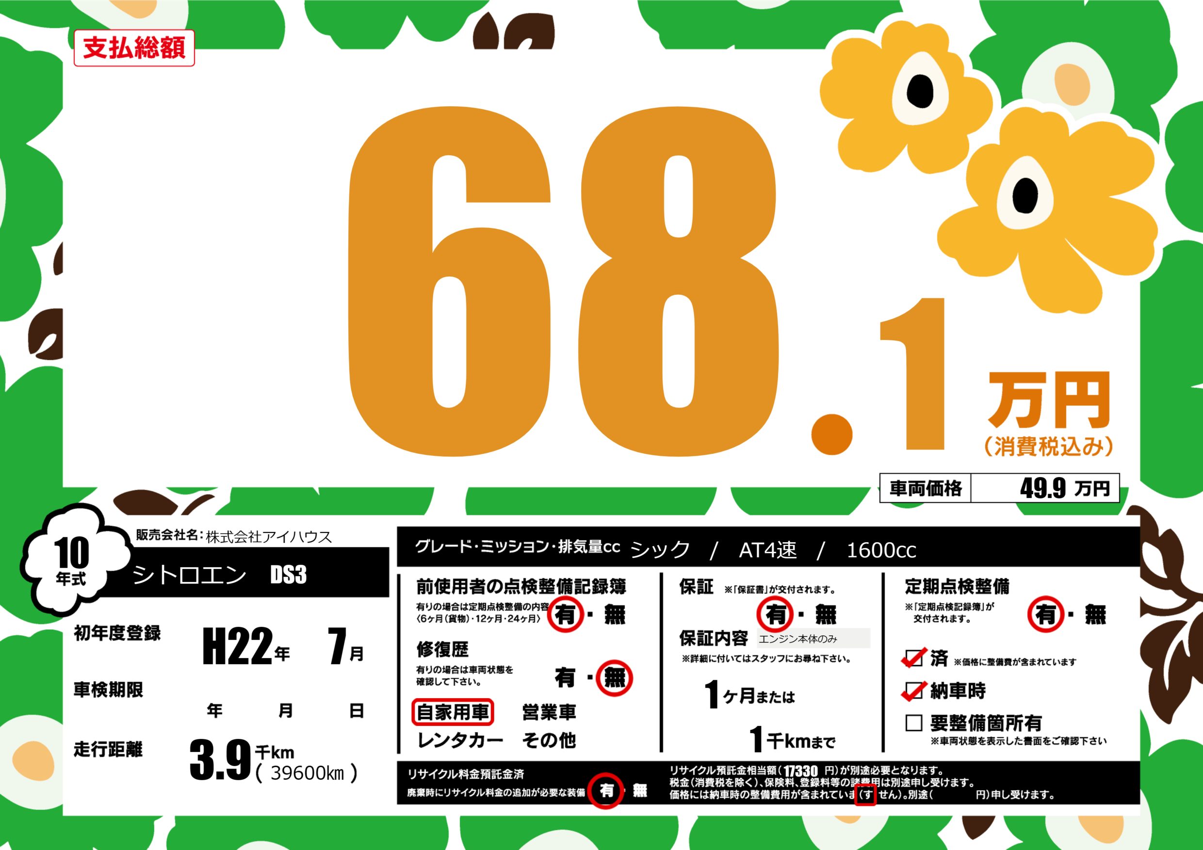 | 車名 | シトロエン DS3 | グレード ミッション 排気量 |