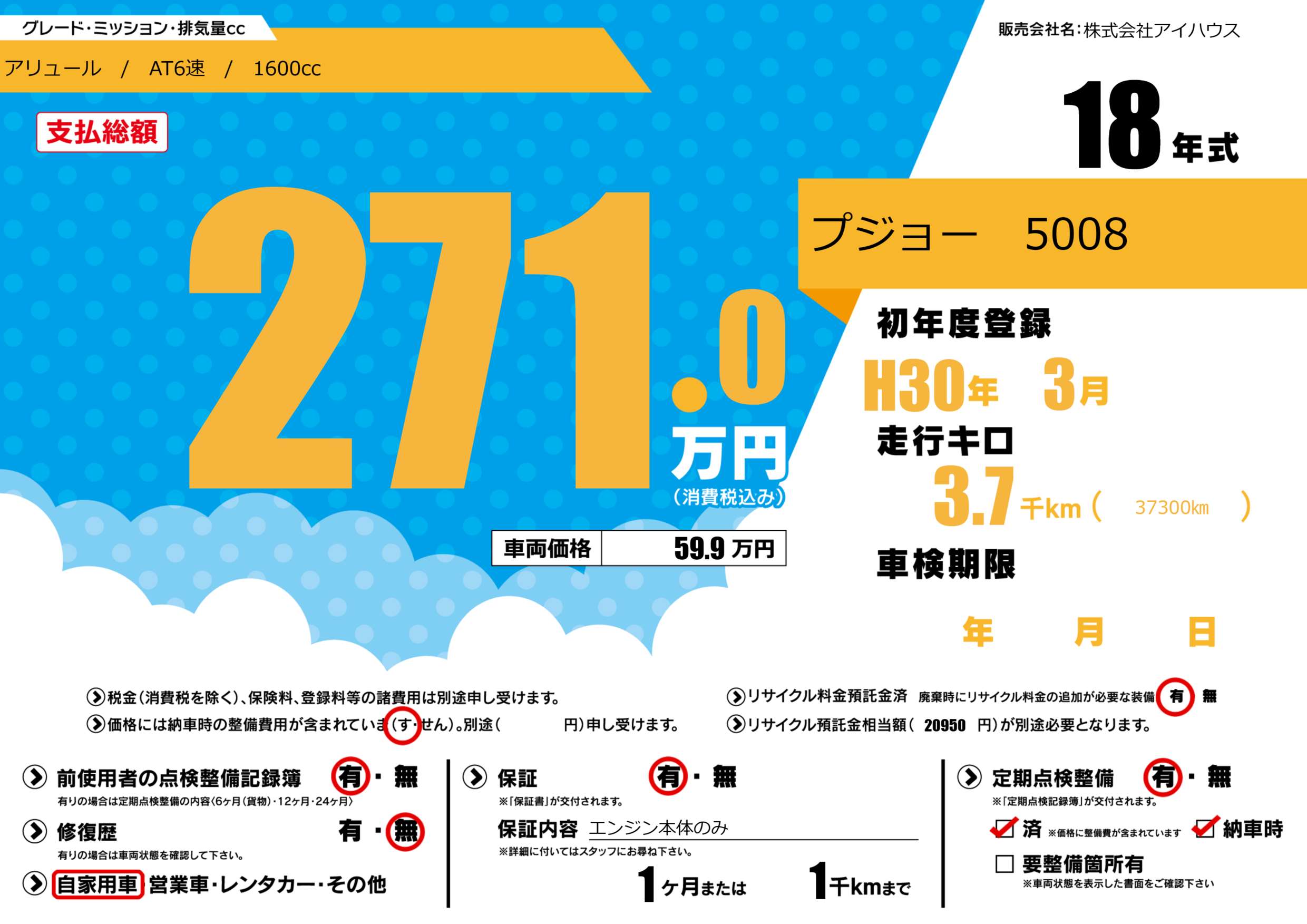 | 車名 | プジョー 5008 | グレード ミッション 排気量 |