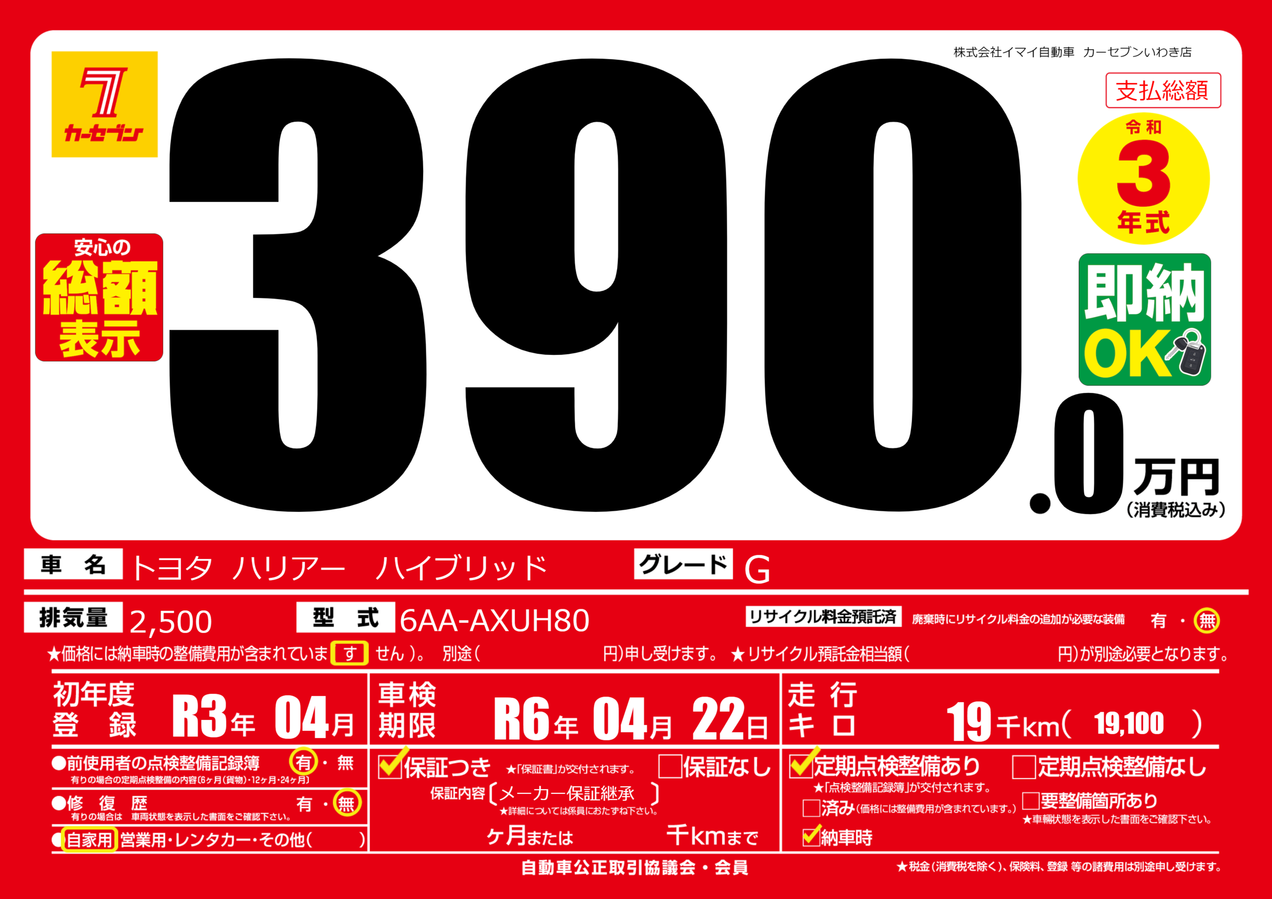 | 走行キロ | 1.9万km | 初年度登録 | R3年04月 |