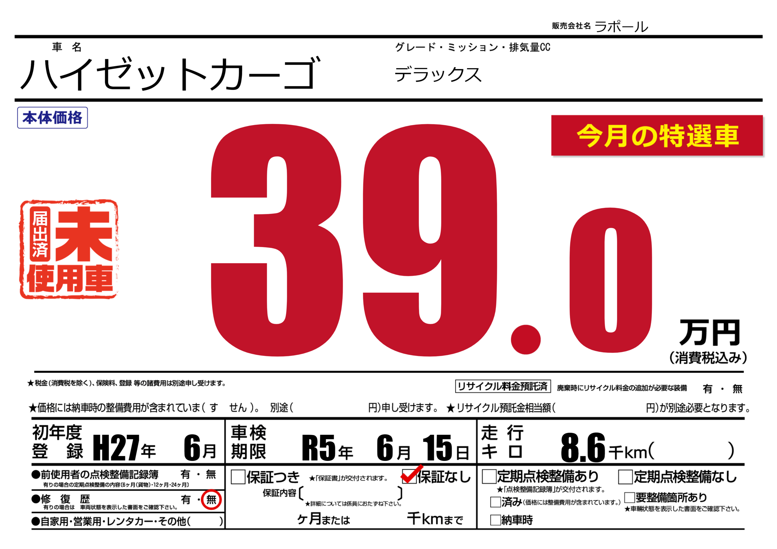 | 車名 | ハイゼットカーゴ | グレード ミッション 排気量 |
