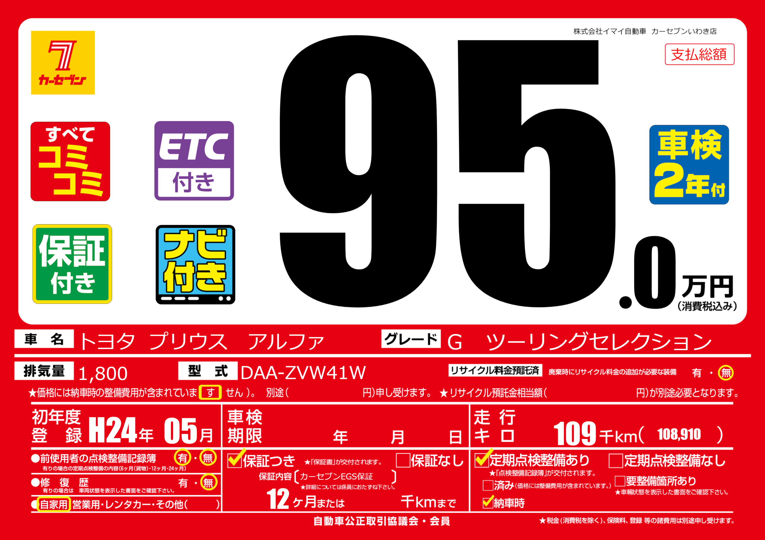 | 走行キロ | 10.9万km | 初年度登録 | H24年05月 |