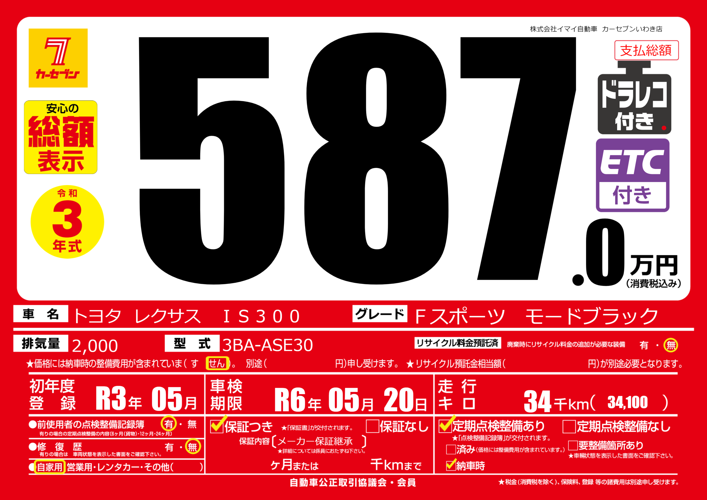 | 車名 | トヨタ レクサス IS300 | グレード ミッション 排気量 |