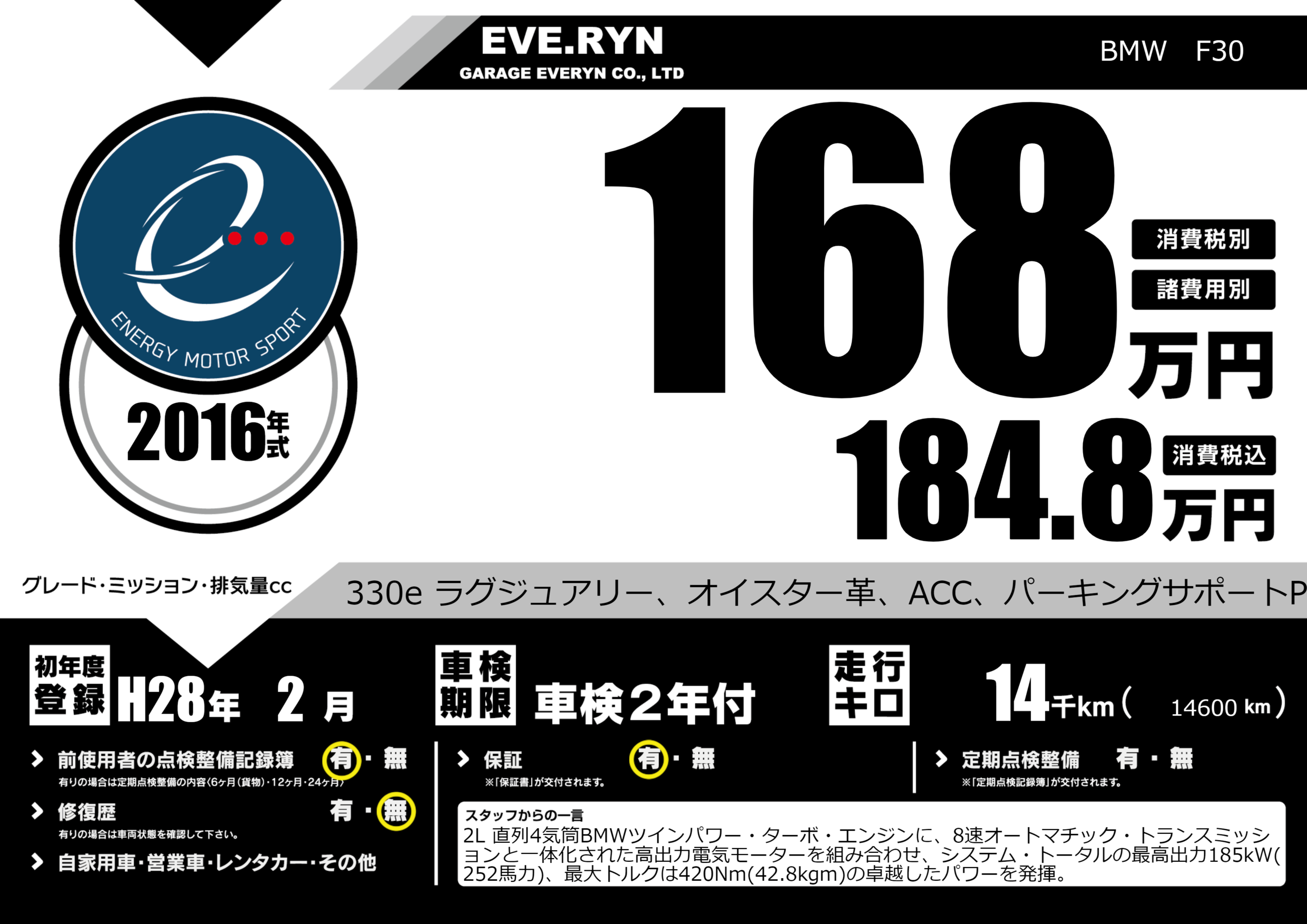 | 車名 | BMW F30 | グレード ミッション 排気量 |
