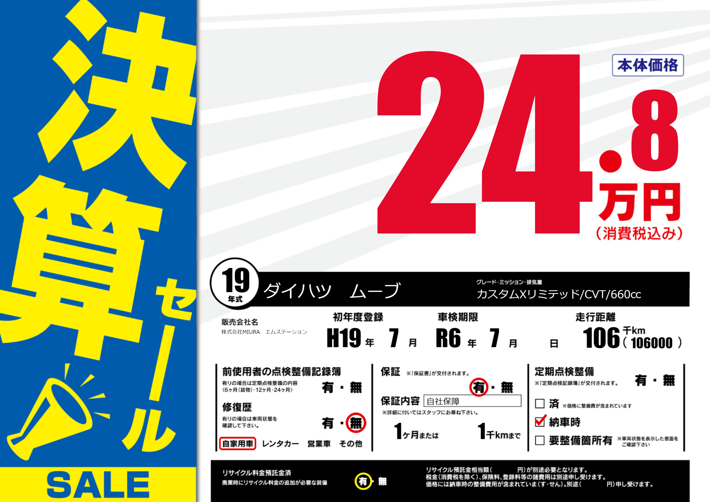 | 車検制限 | R6年 7月 - 日 | ||
