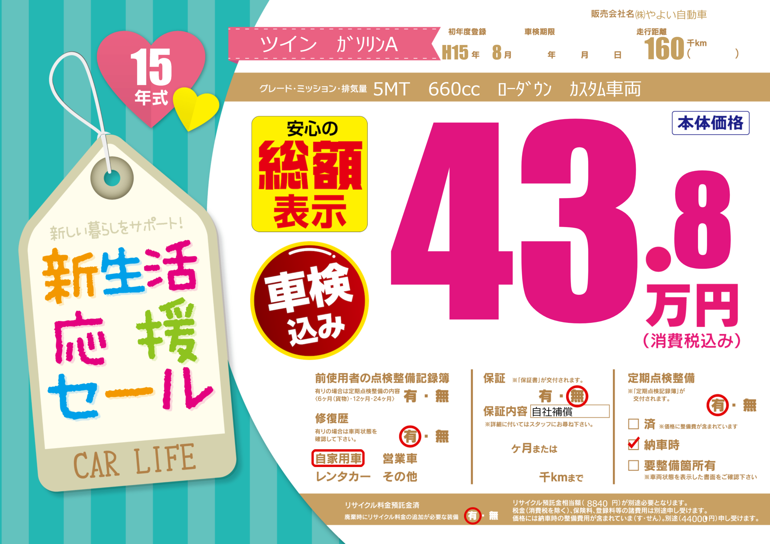 保証なし 保証内容(自社補償) ---ヶ月または()千kmまで |