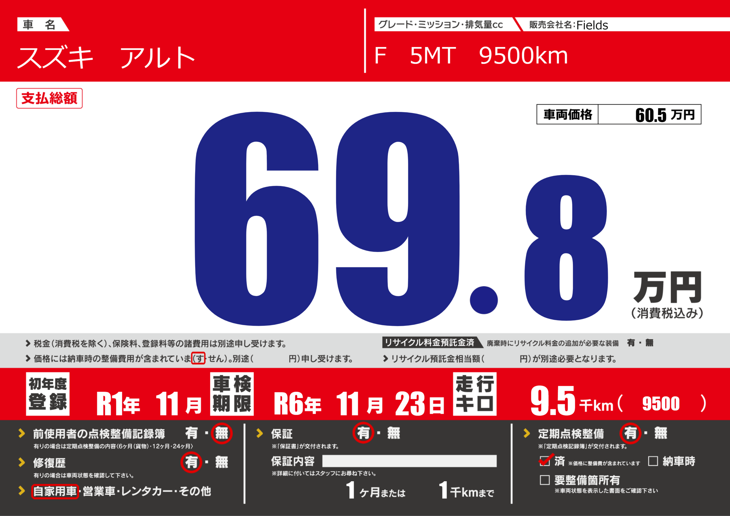 | 定期点検整備 | 定期点検整備あり 定期点検整備済み | ||