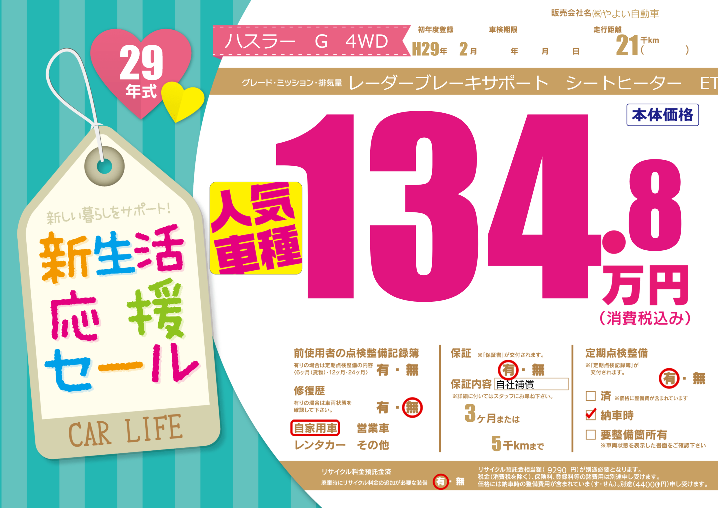 保証付き 保証内容(自社補償) 3ヶ月または(5)千kmまで |