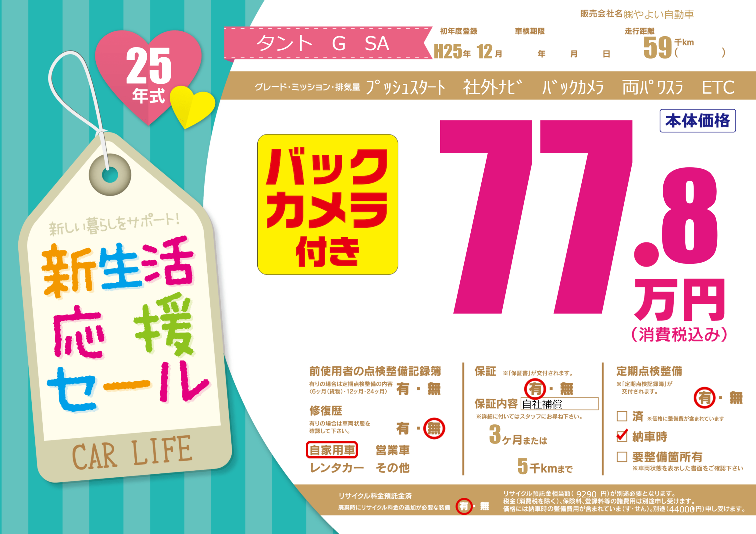 | 車名 | タント G SA | グレード ミッション 排気量 |
