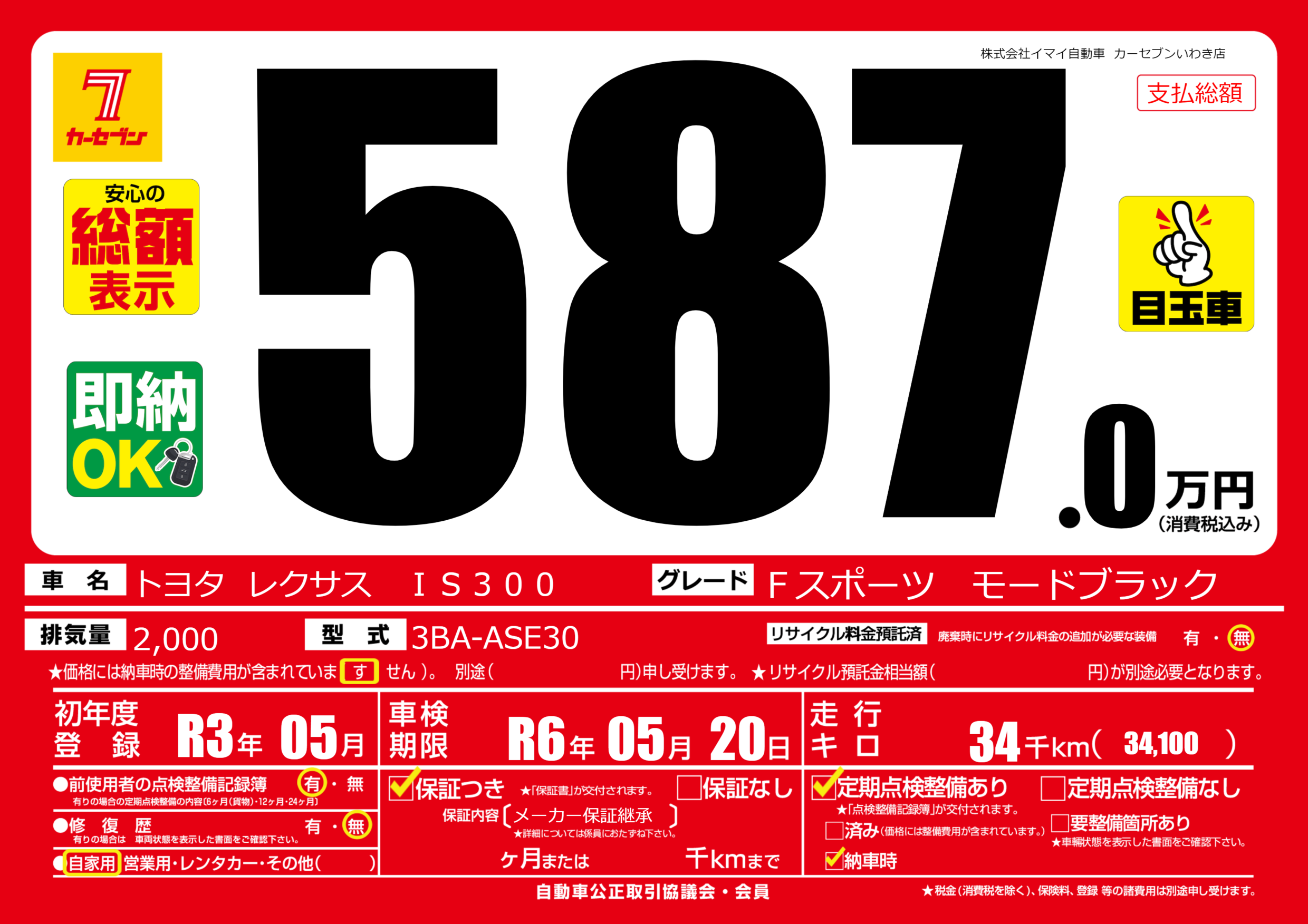 | 車名 | トヨタ レクサス IS300 | グレード ミッション 排気量 |