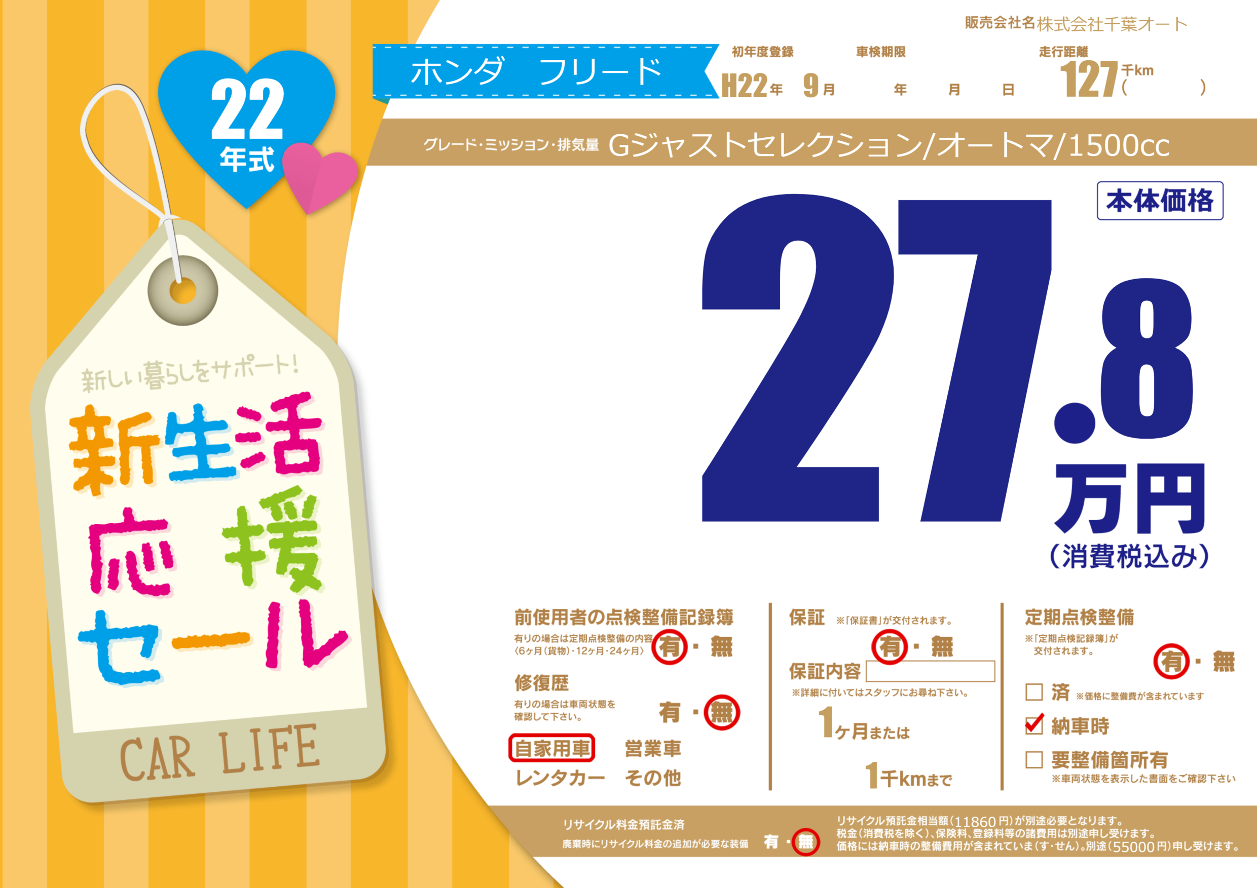 | 走行キロ | 12.7万km | 初年度登録 | H22年9月 |