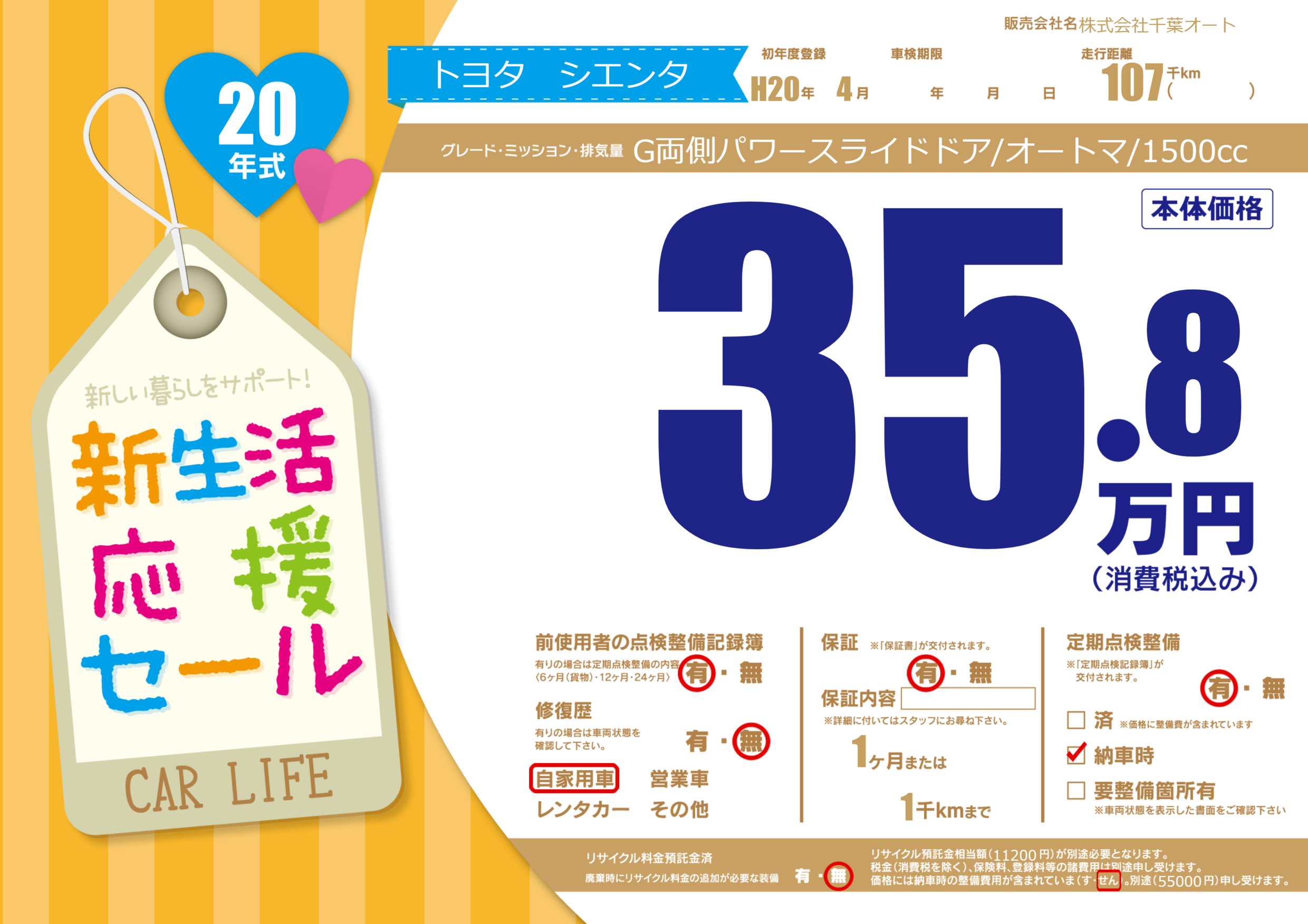 | 車名 | トヨタ シエンタ | グレード ミッション 排気量 |