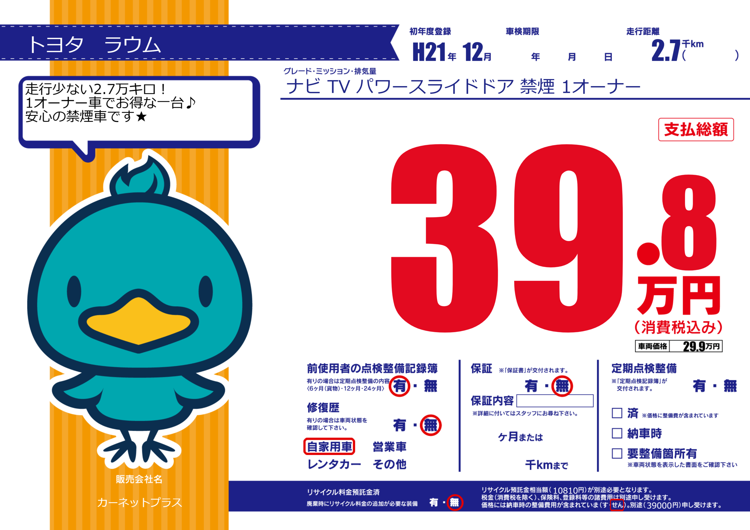 | 車名 | トヨタ ラウム | グレード ミッション 排気量 |