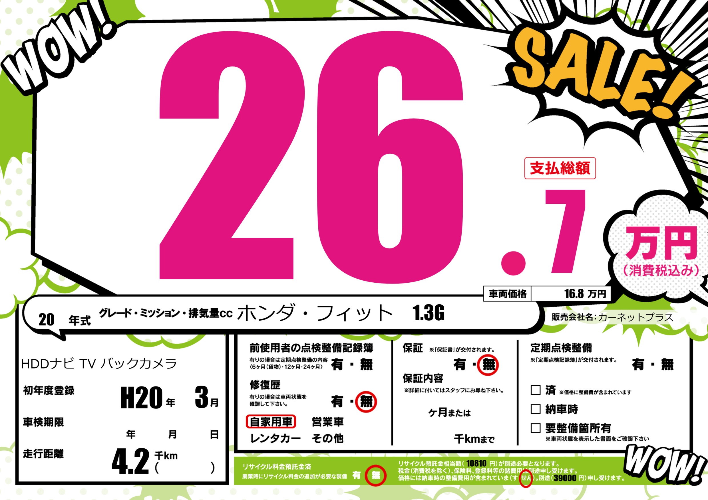 | 走行キロ | 0.4万km | 初年度登録 | H20年3月 |
