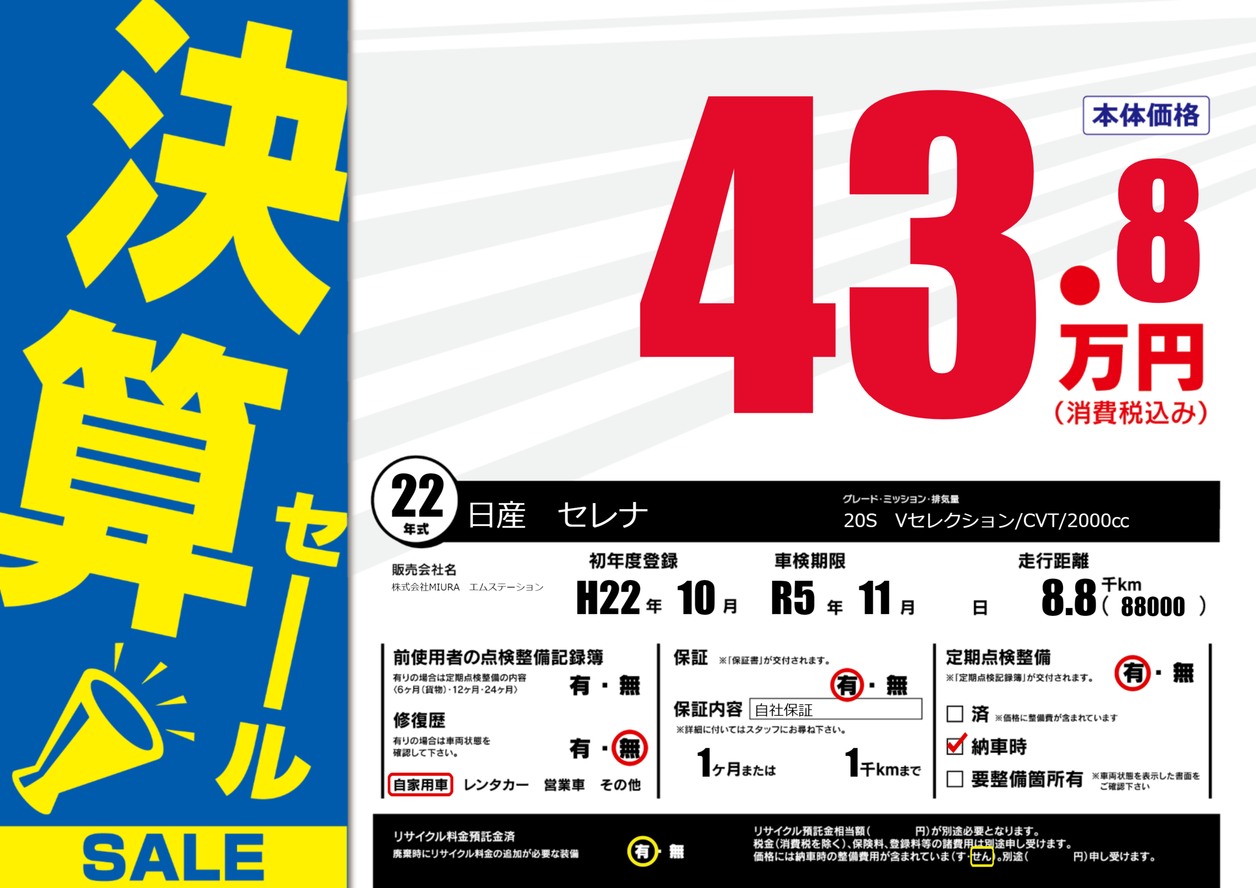 | 車名 | 日産 セレナ | グレード ミッション 排気量 |