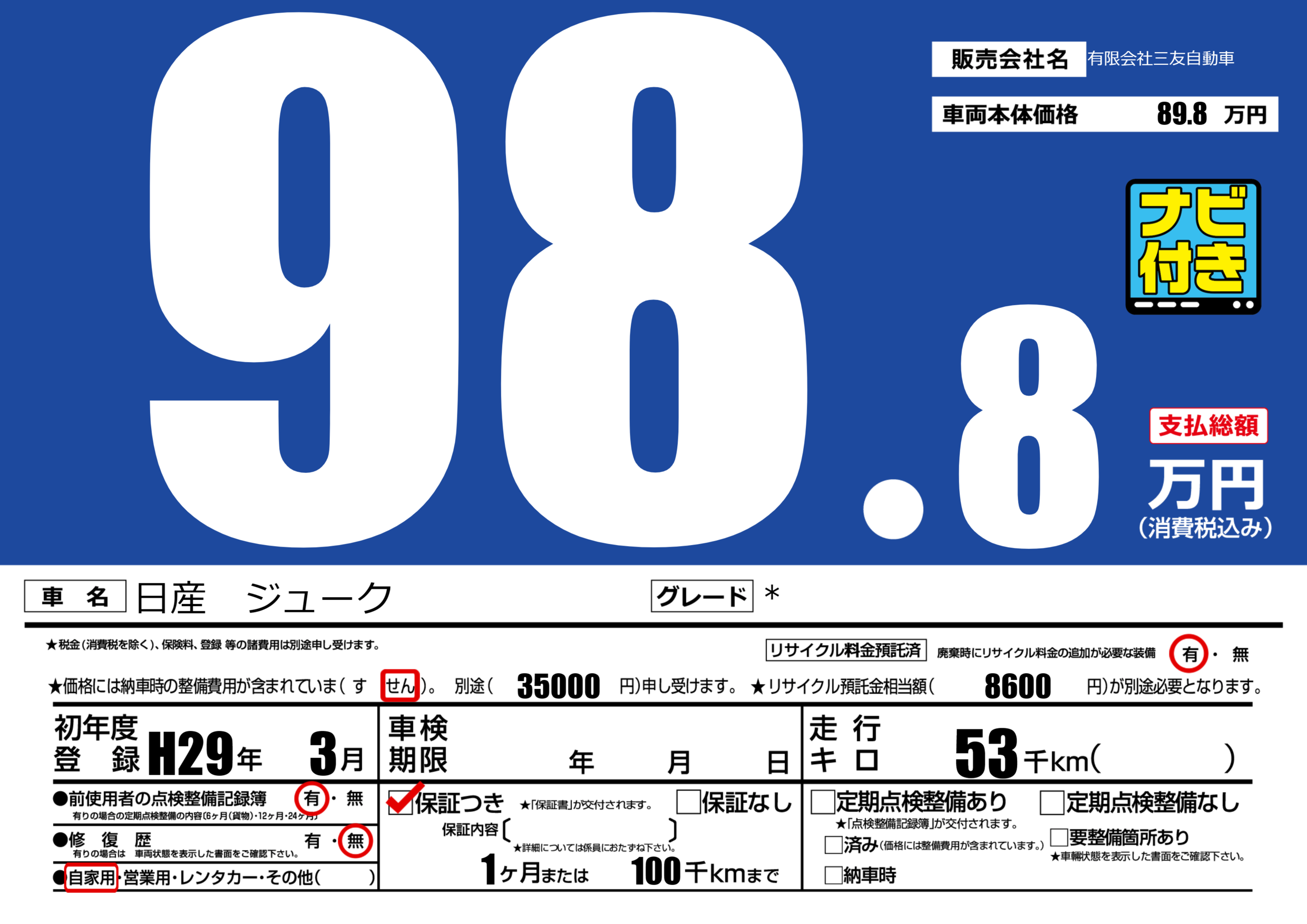 | 車名 | 日産 ジューク | グレード ミッション 排気量 |