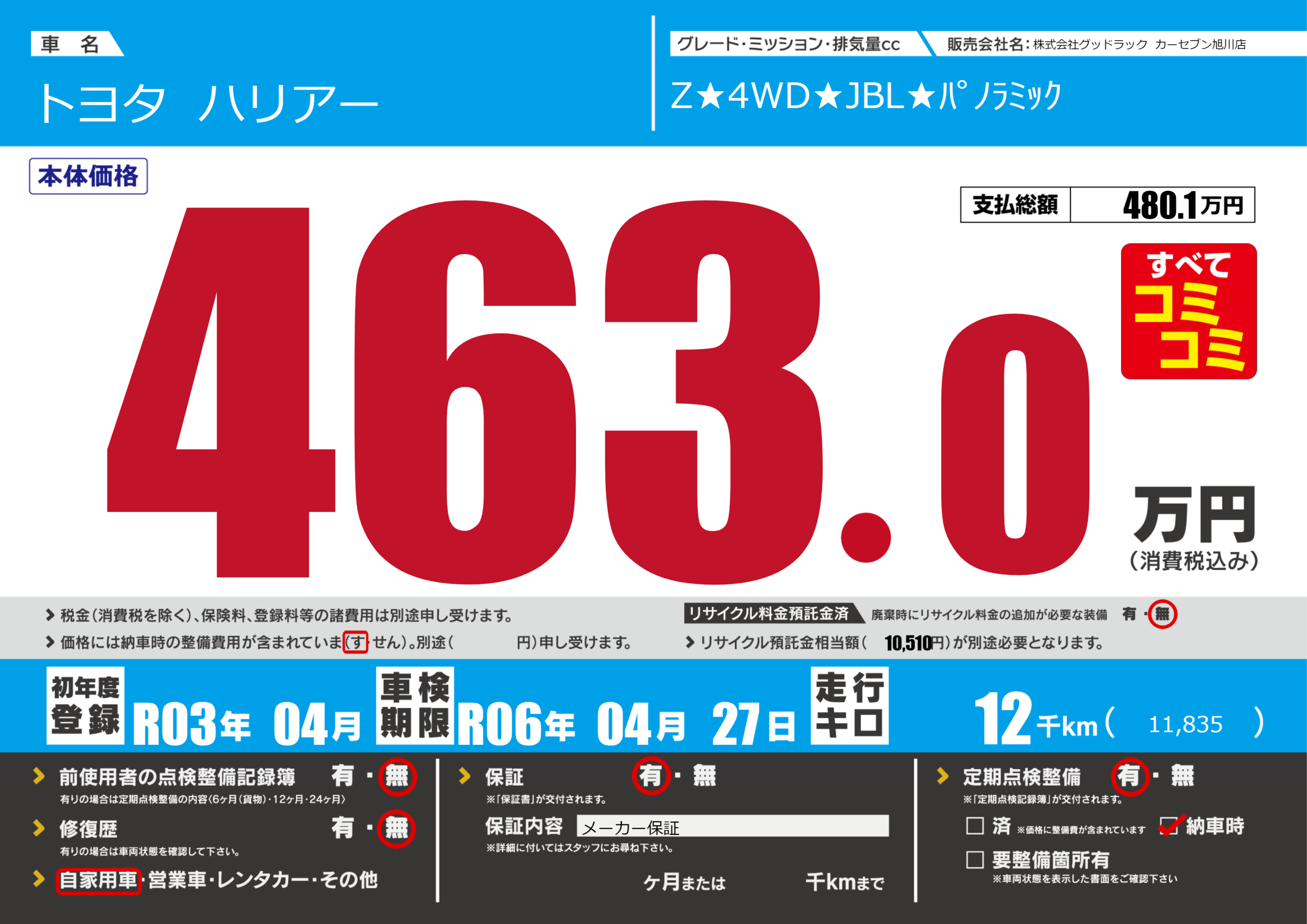 | 走行キロ | 1.2万km | 初年度登録 | R03年04月 |