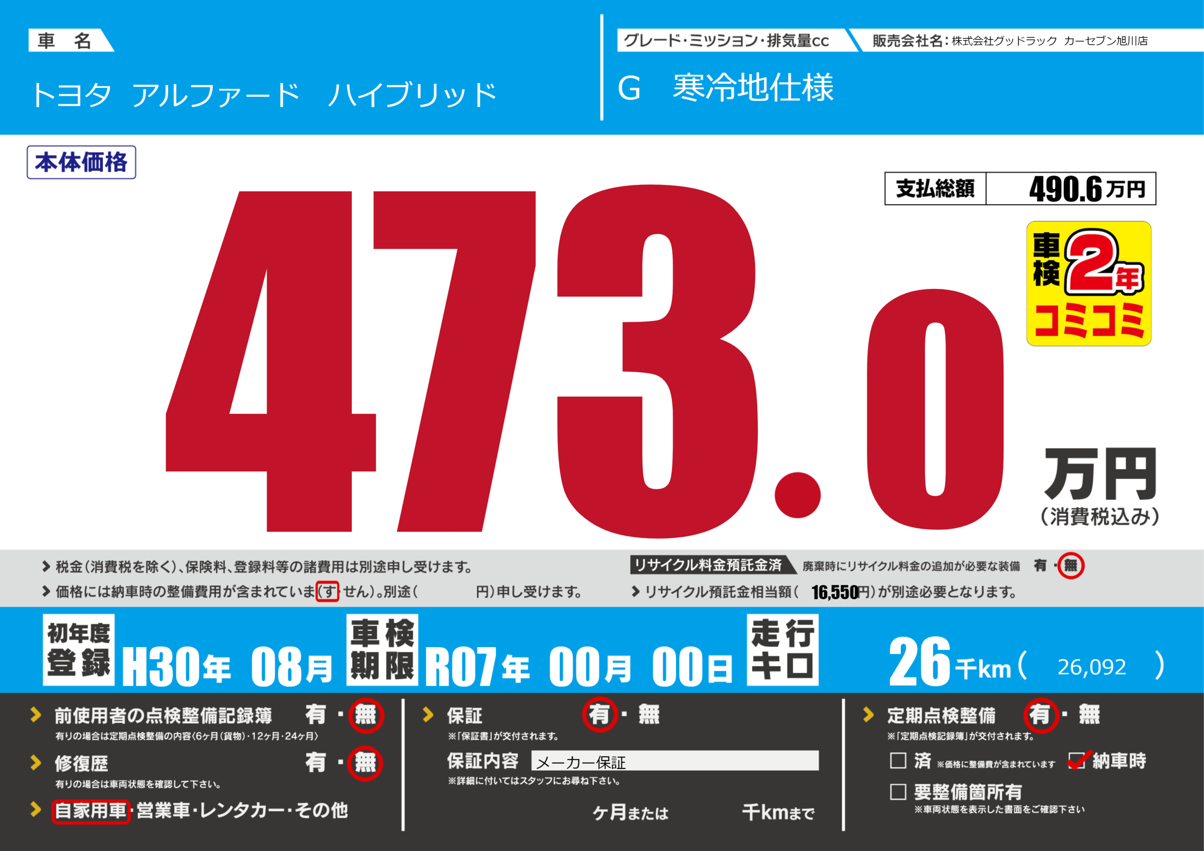 | 車名 | トヨタ アルファード ハイブリッド | グレード ミッション 排気量 |