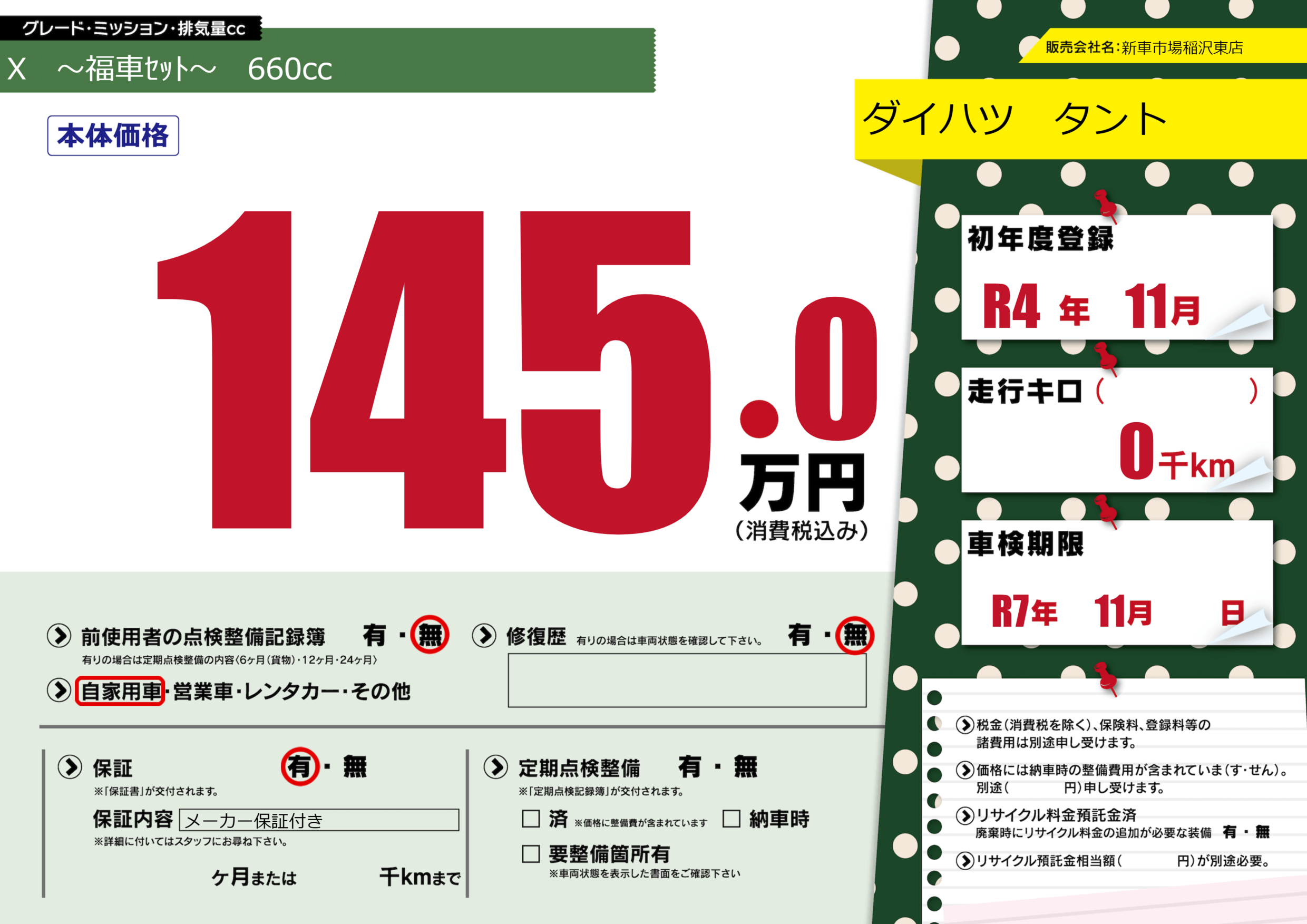 保証付き 保証内容(メーカー保証付き) ---ヶ月または()千kmまで |