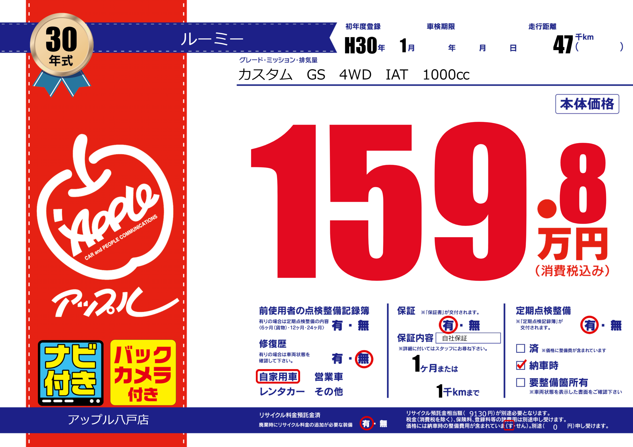 | 車名 | ルーミー | グレード ミッション 排気量 |