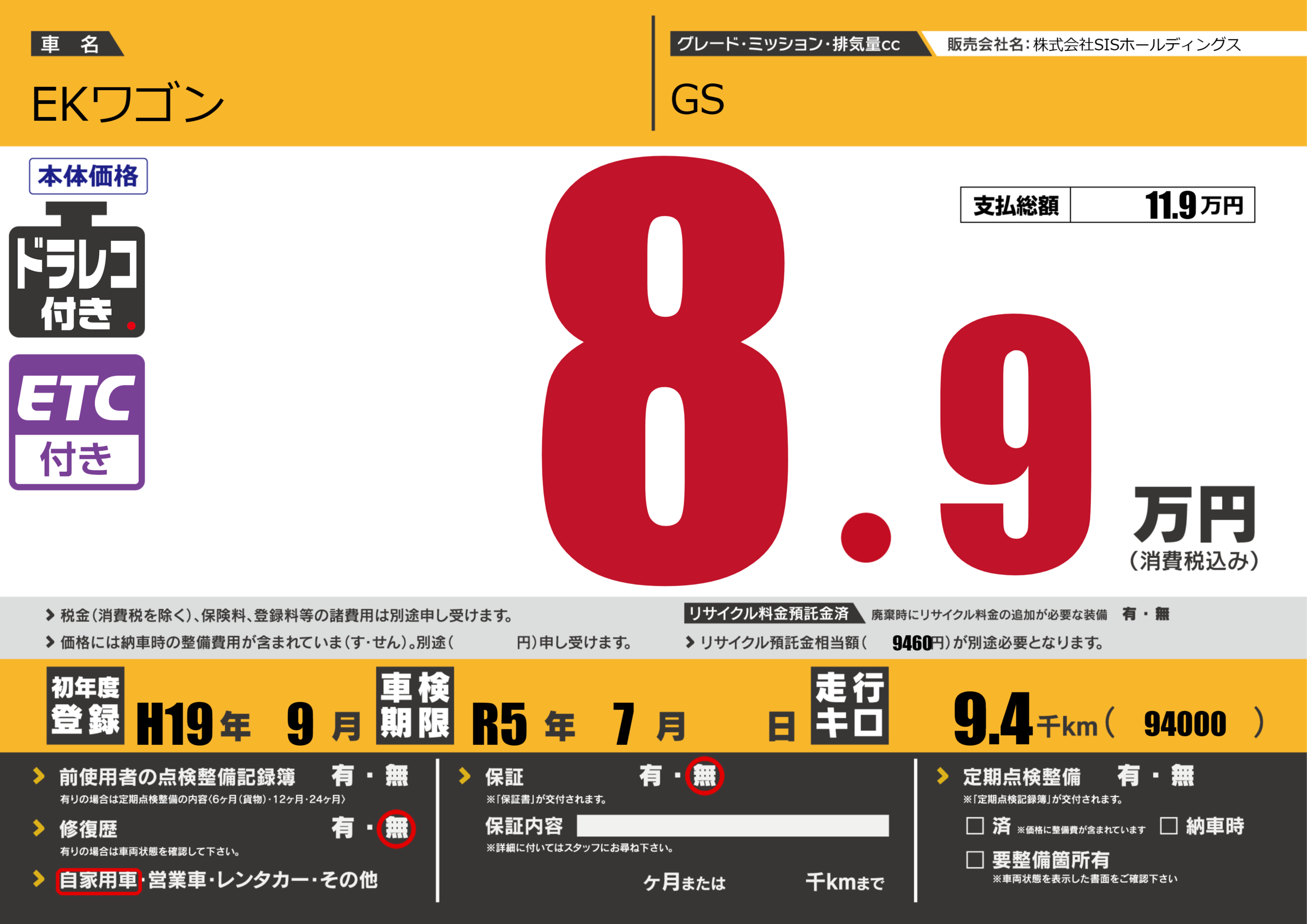 | 車名 | EKワゴン | グレード ミッション 排気量 |