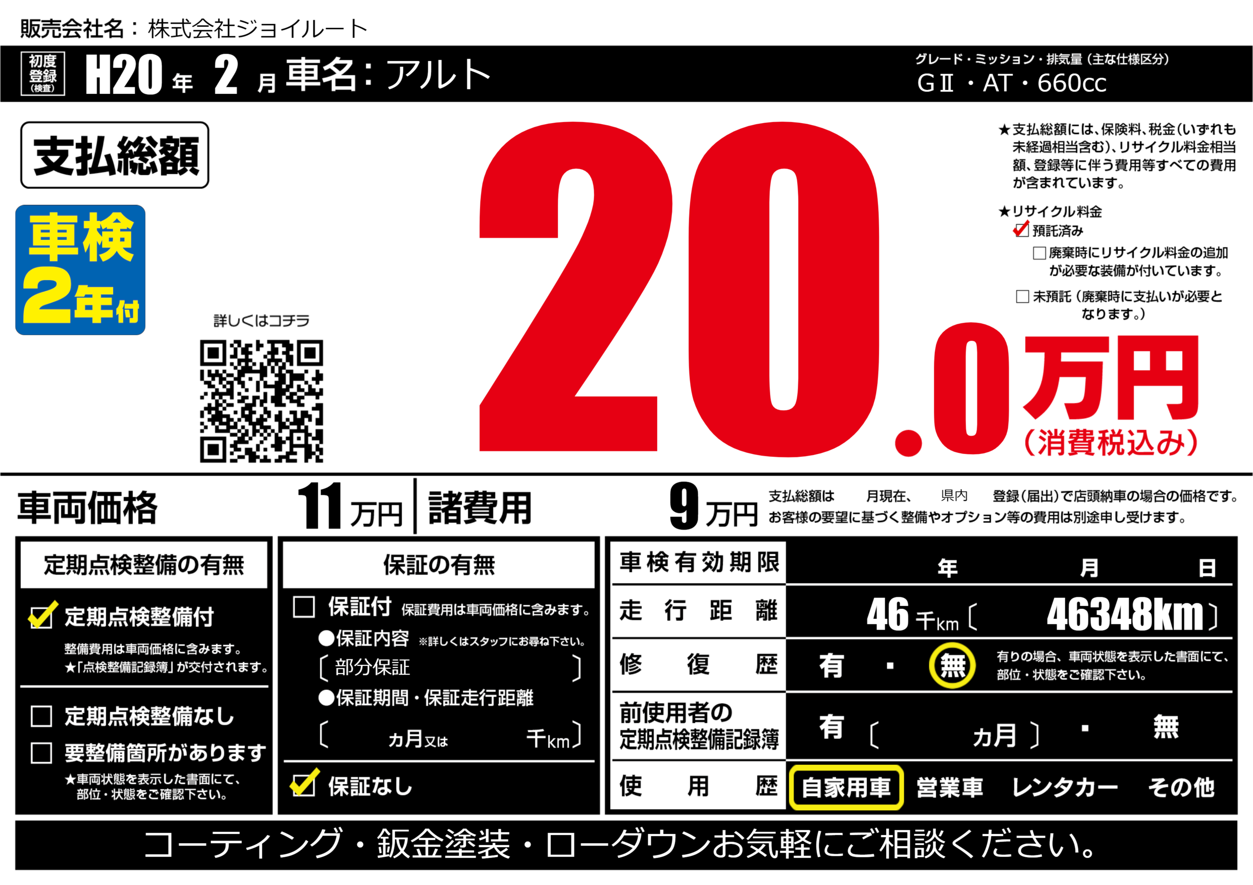 | 走行キロ | 4.6万km | 初年度登録 | H20年2月 |