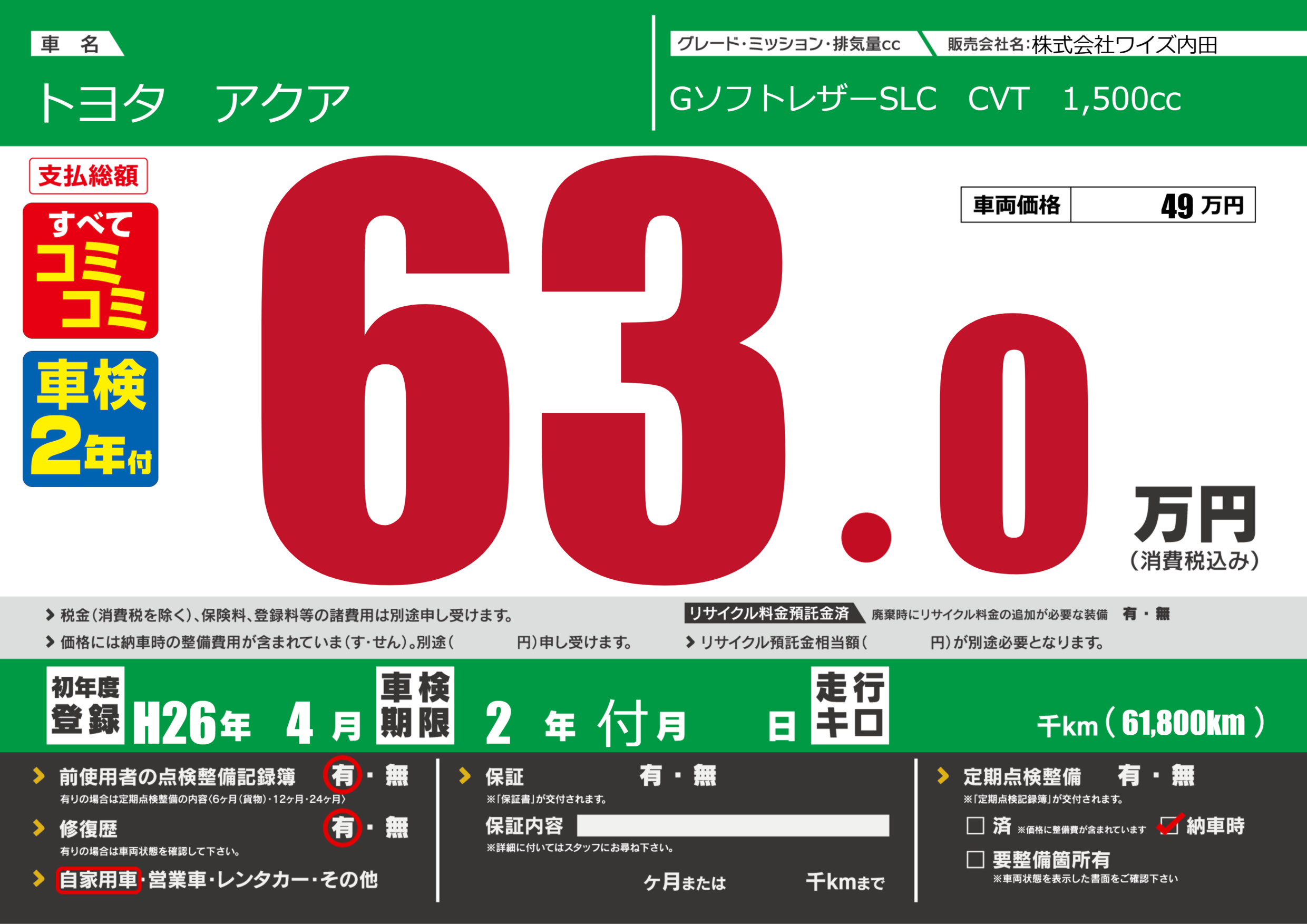 | 車名 | トヨタ アクア | グレード ミッション 排気量 |