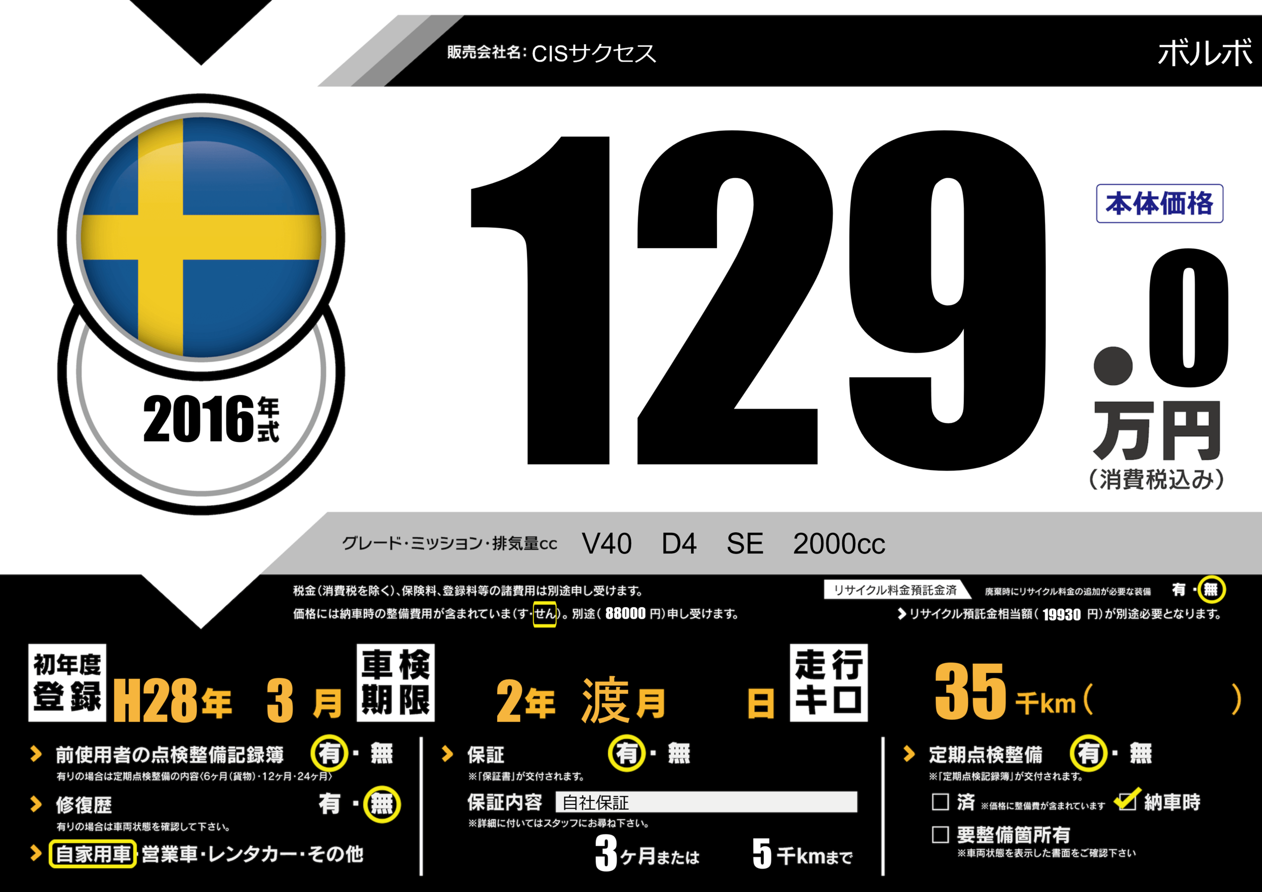 保証付き 保証内容(自社保証) 3ヶ月または(5)千kmまで |