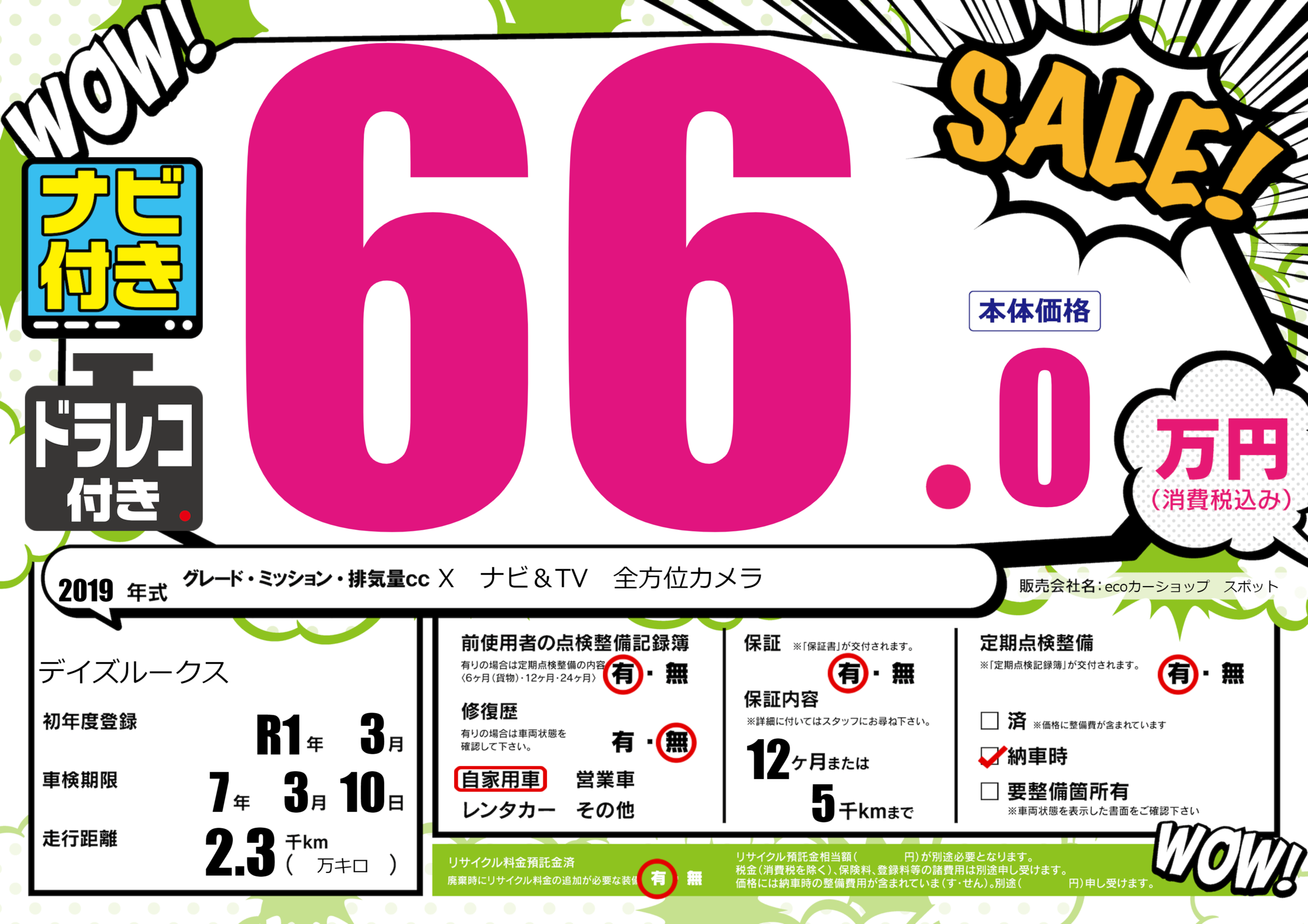| 車名 | デイズルークス | グレード ミッション 排気量 |