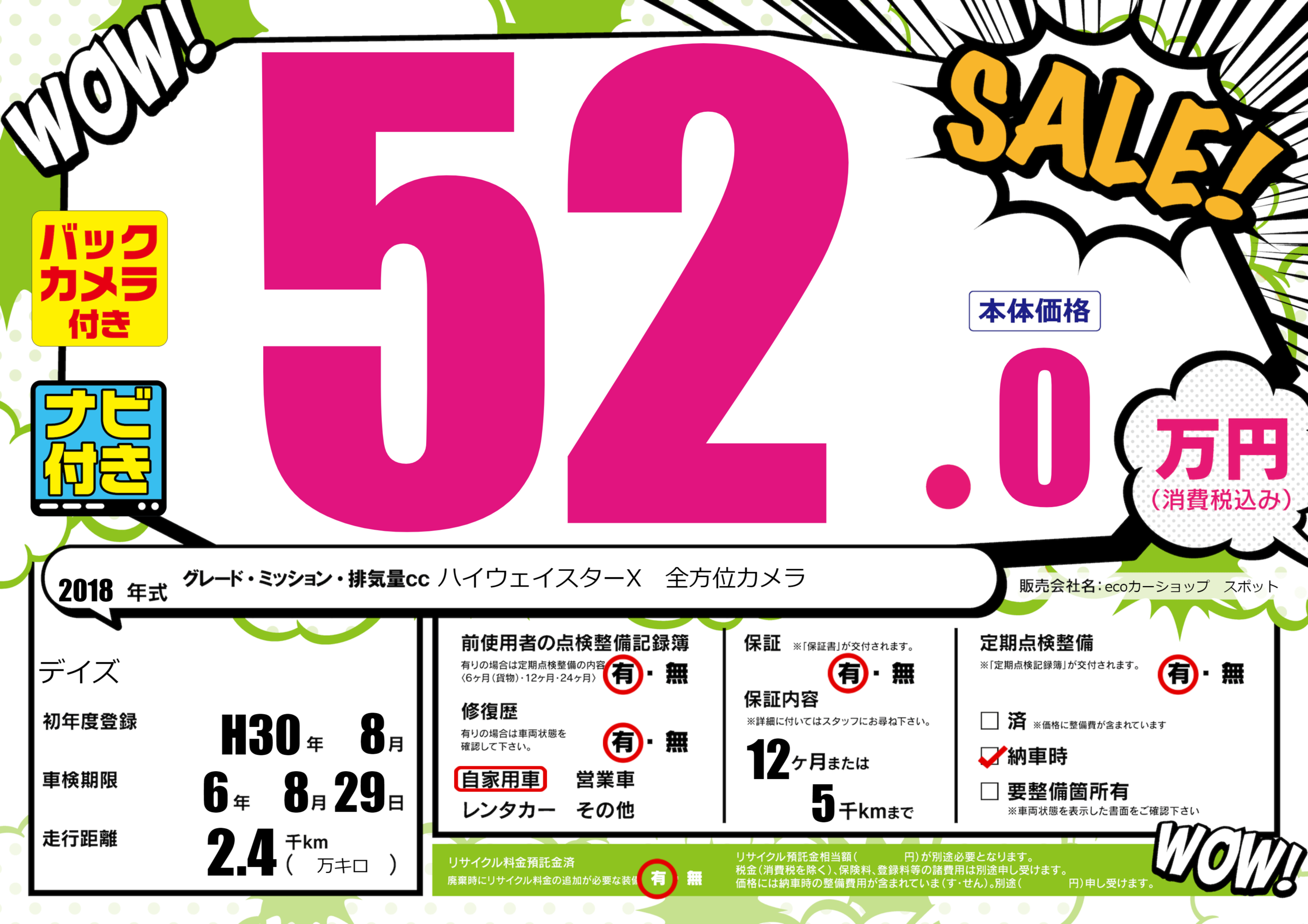 | 走行キロ | 0.2万km | 初年度登録 | H30年8月 |