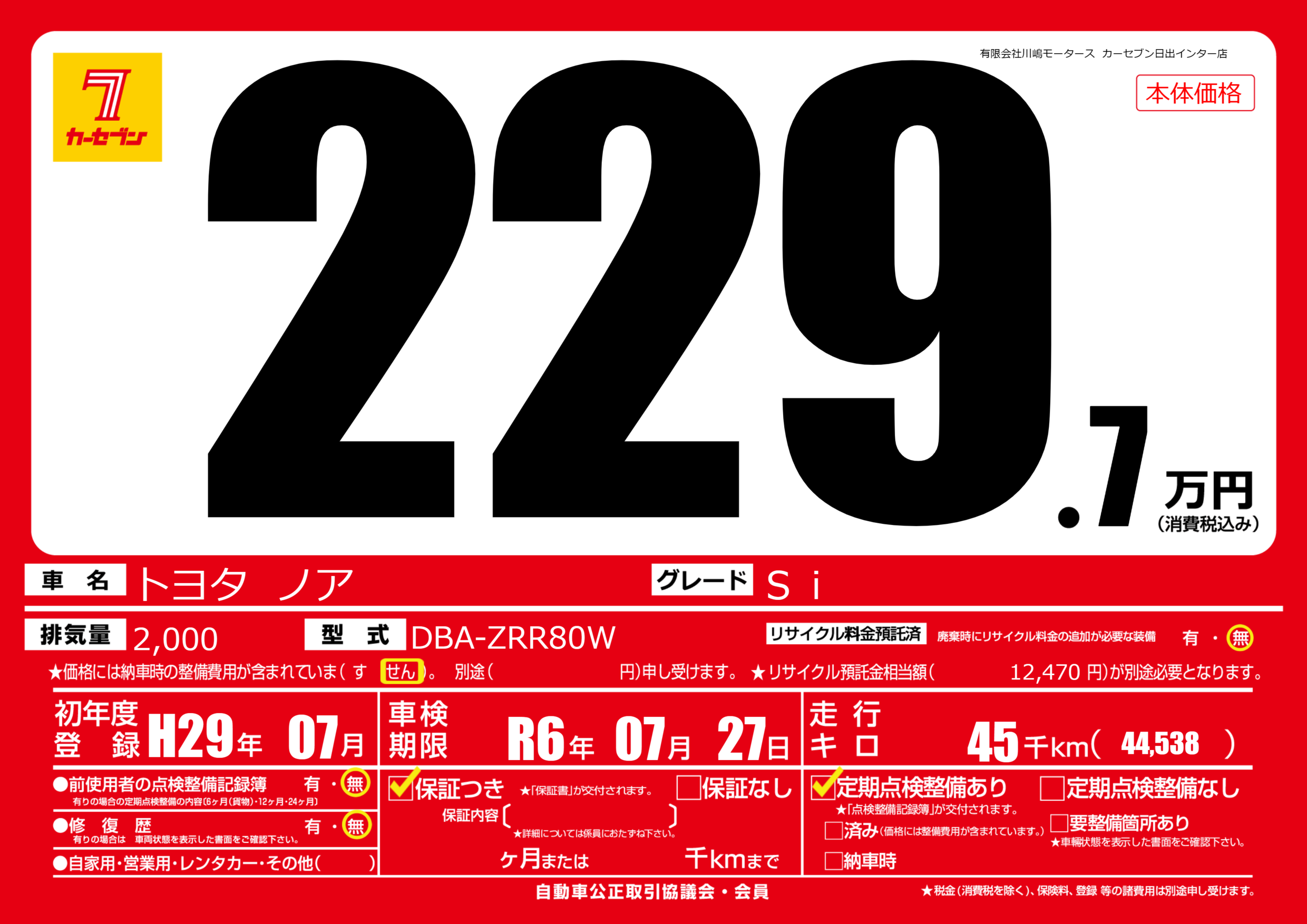 | 車名 | トヨタ ノア | グレード ミッション 排気量 |